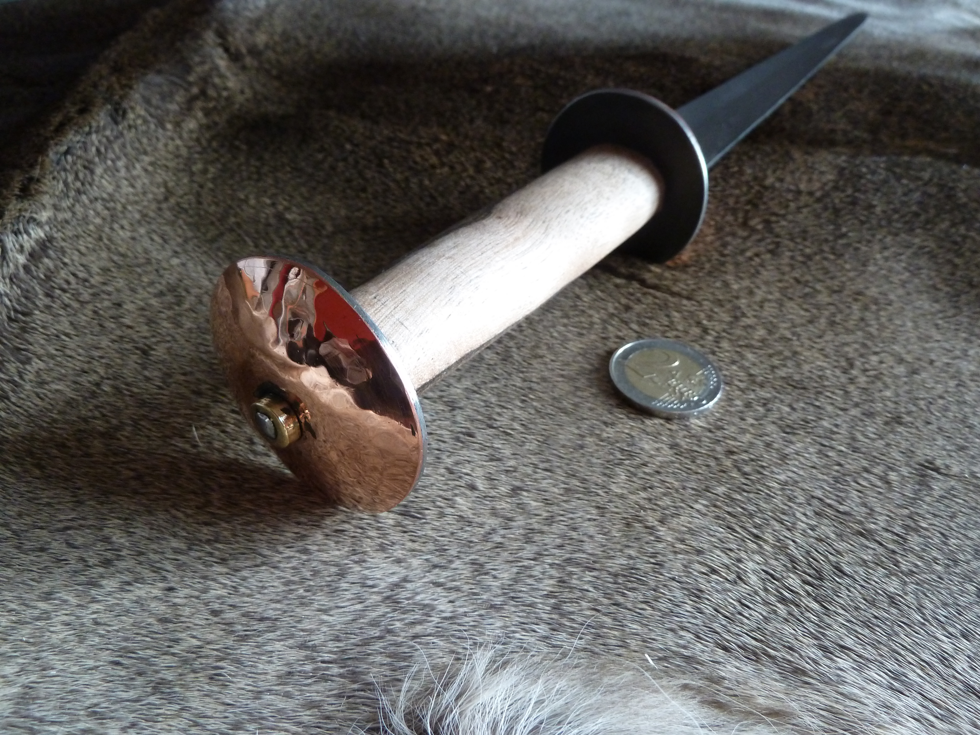 Lame en acier ressort (trempe dure), garde et pommeau cuivre martelés (intérieur acier), fusée noyer.