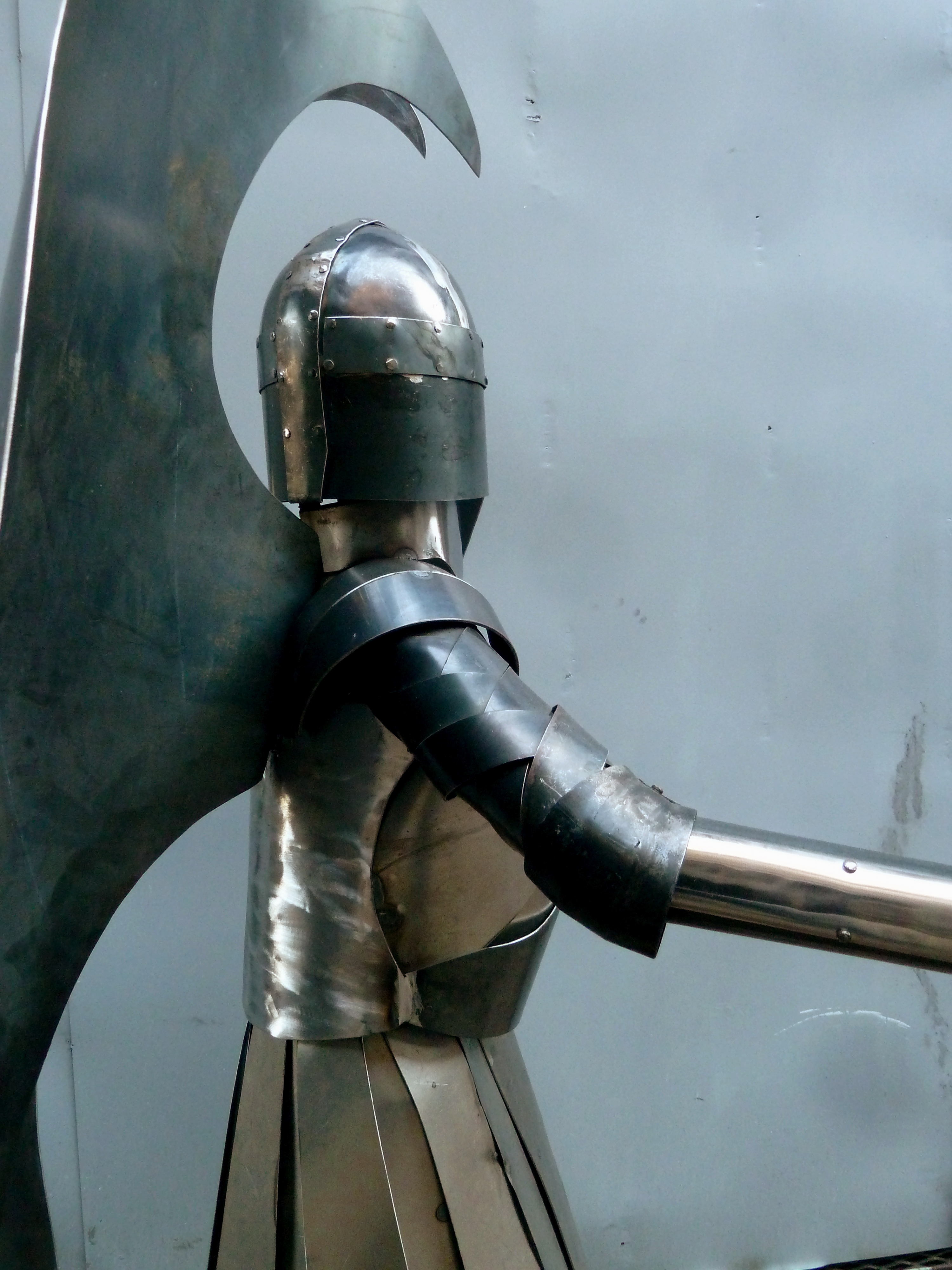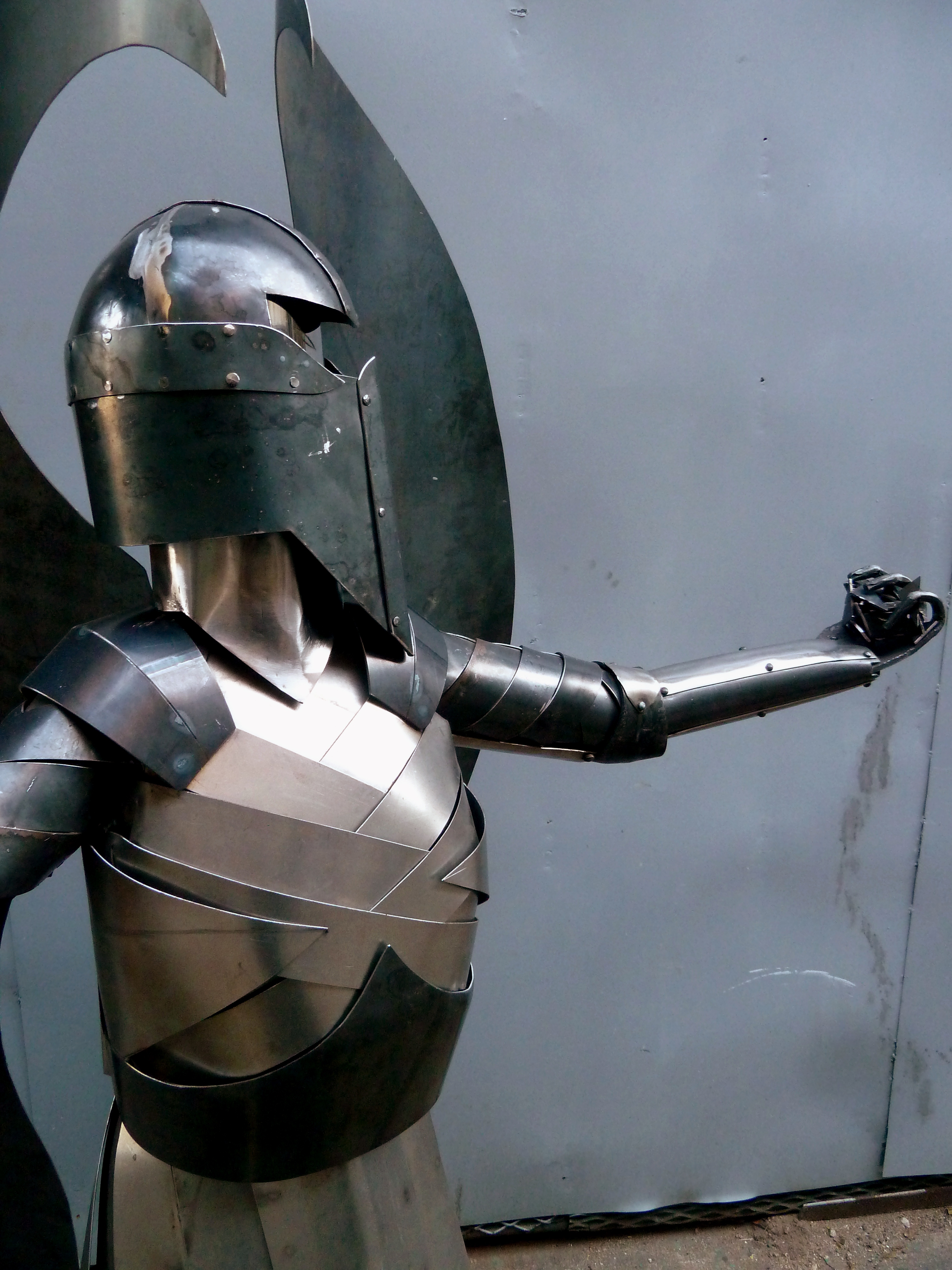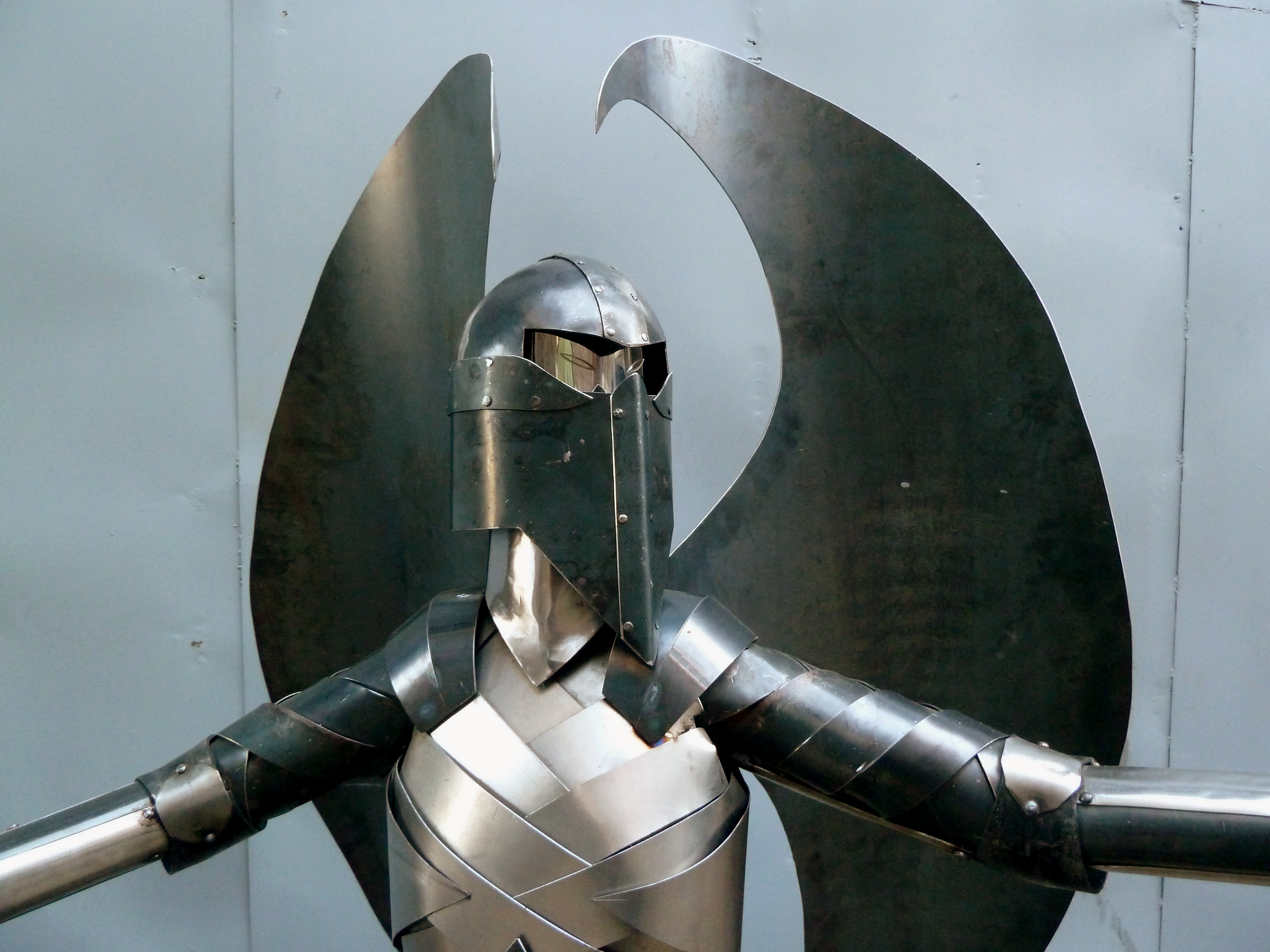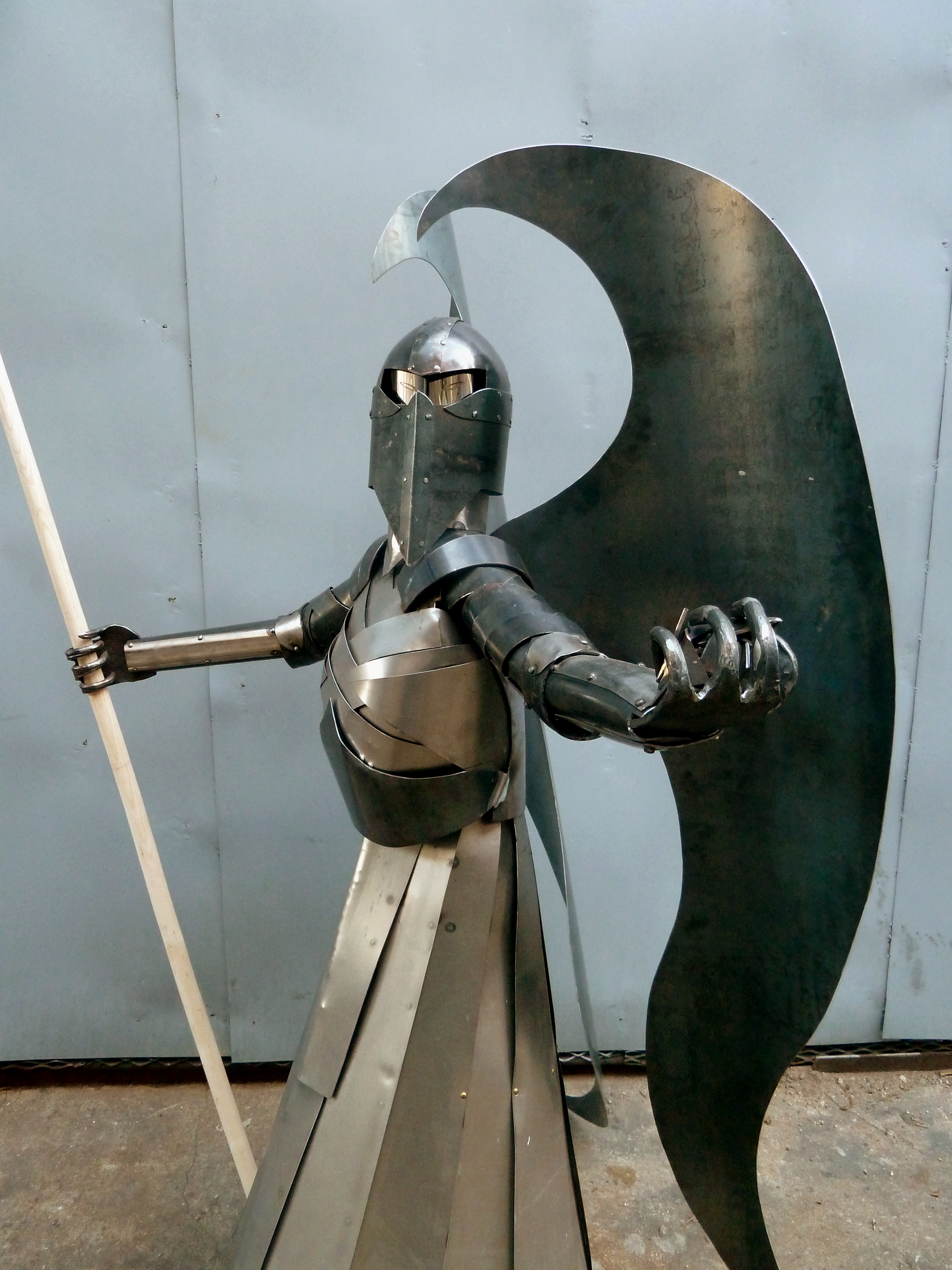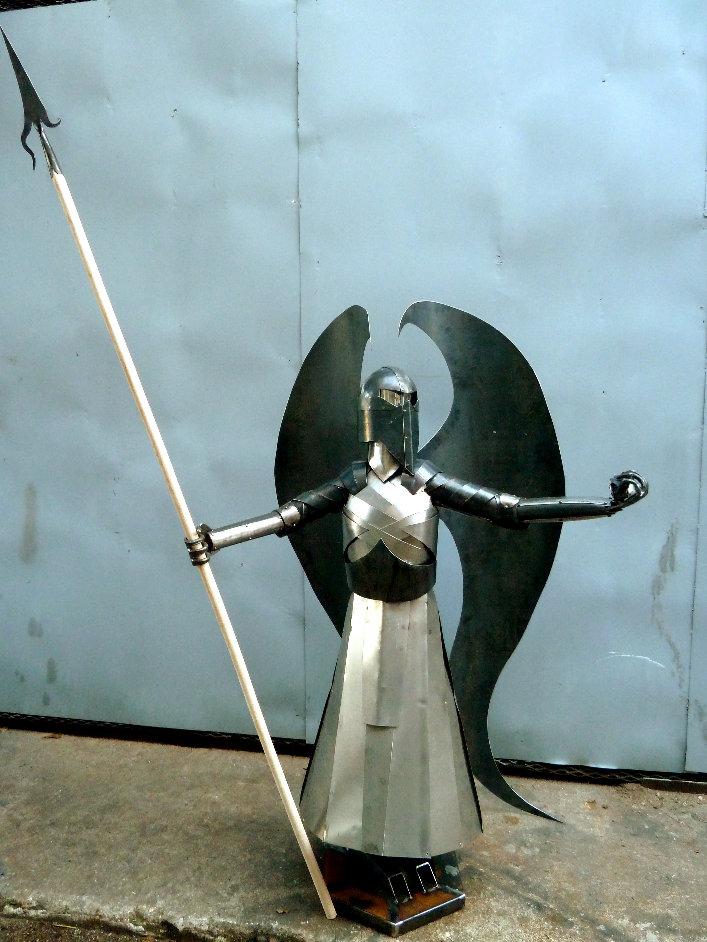 Ange en armure tenant un cœur de démon en sa main gauche et une lance en sa main droite.