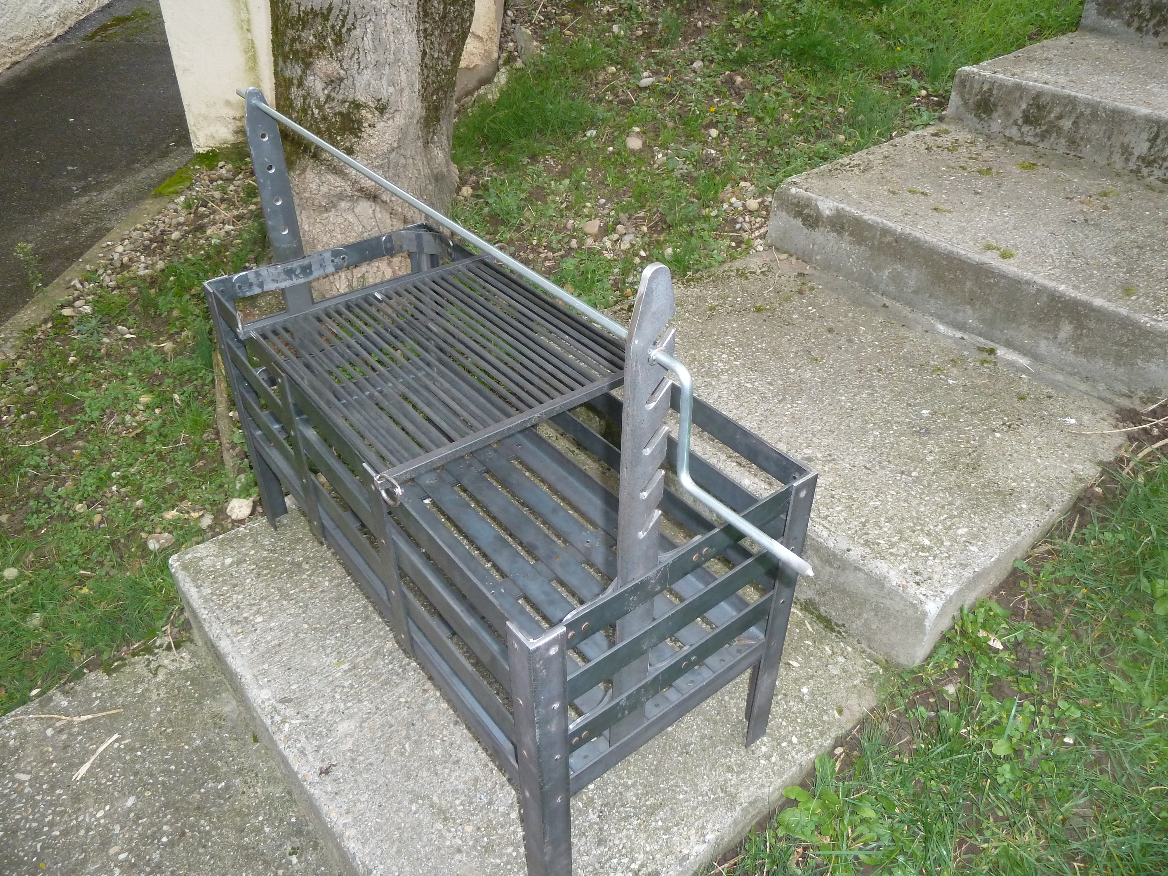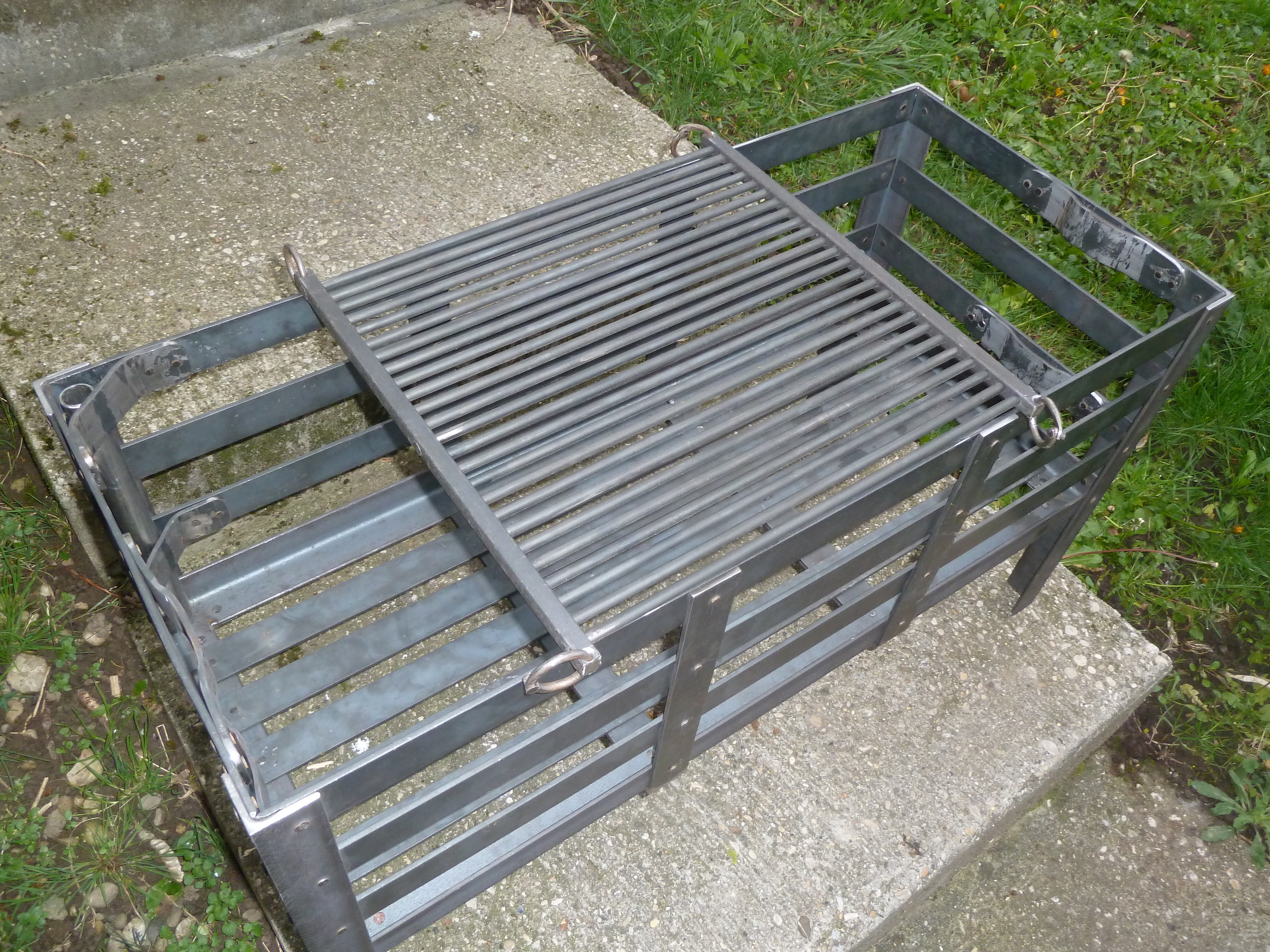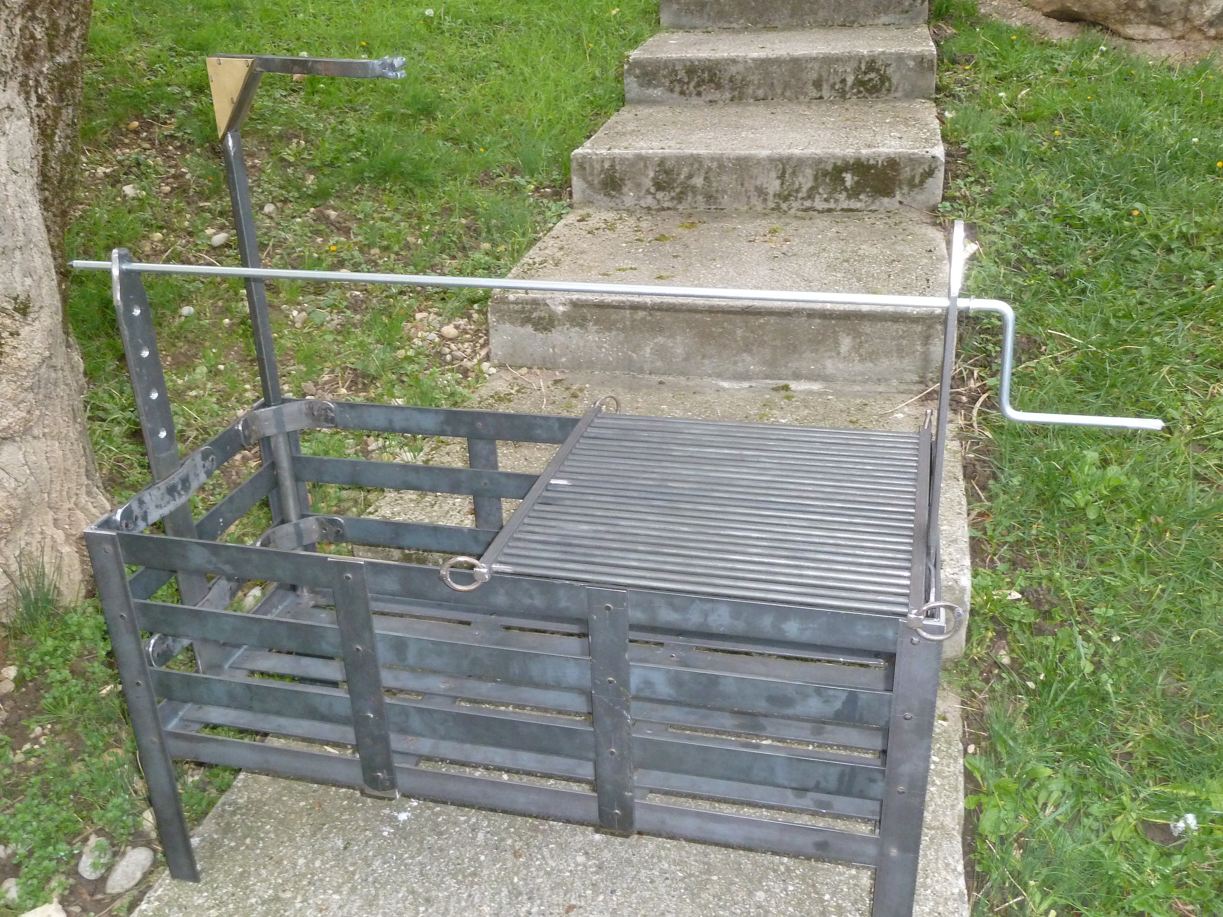 Un berceau à feu entièrement riveter avec grille, potence à chaudron et broche.