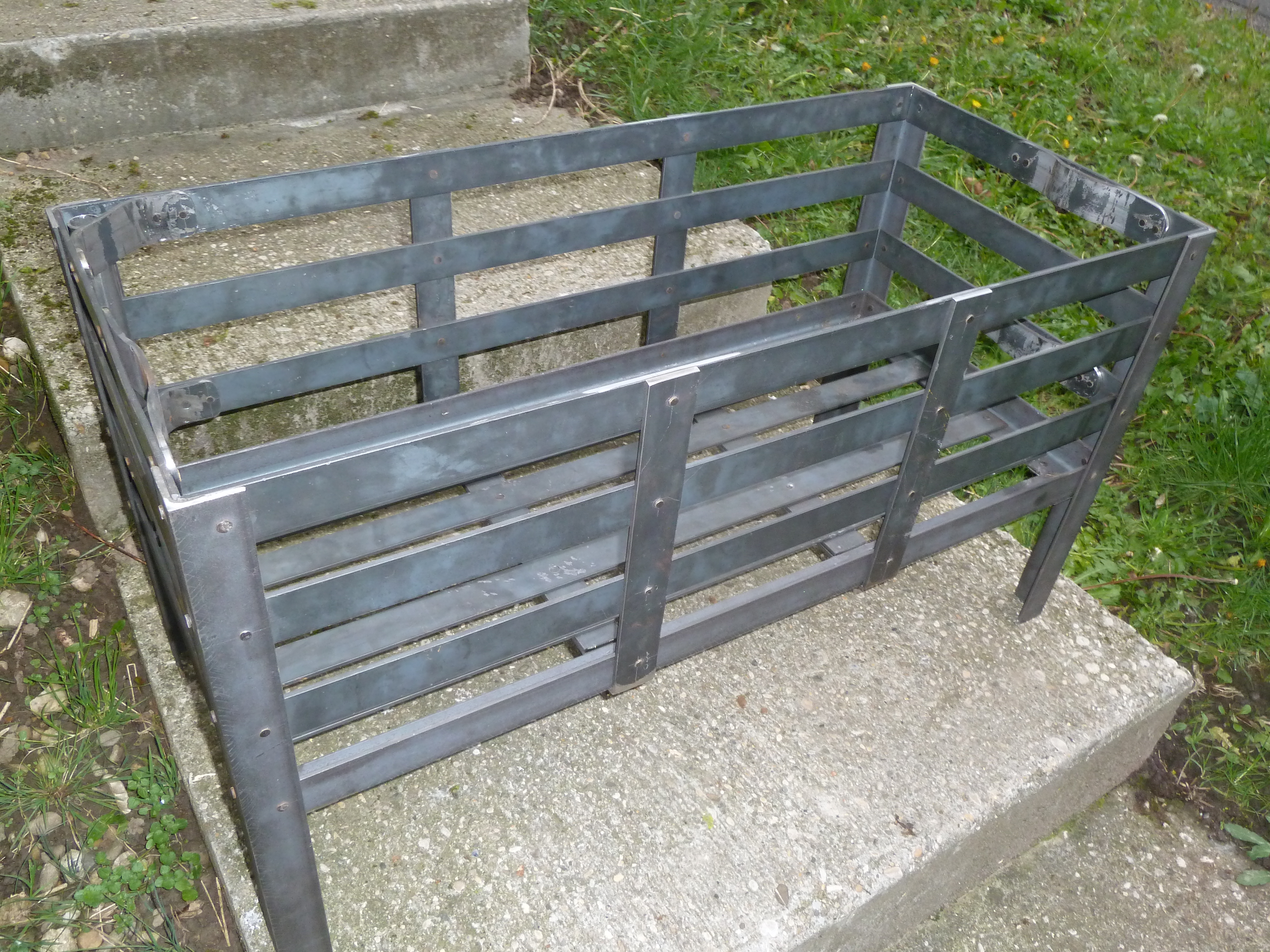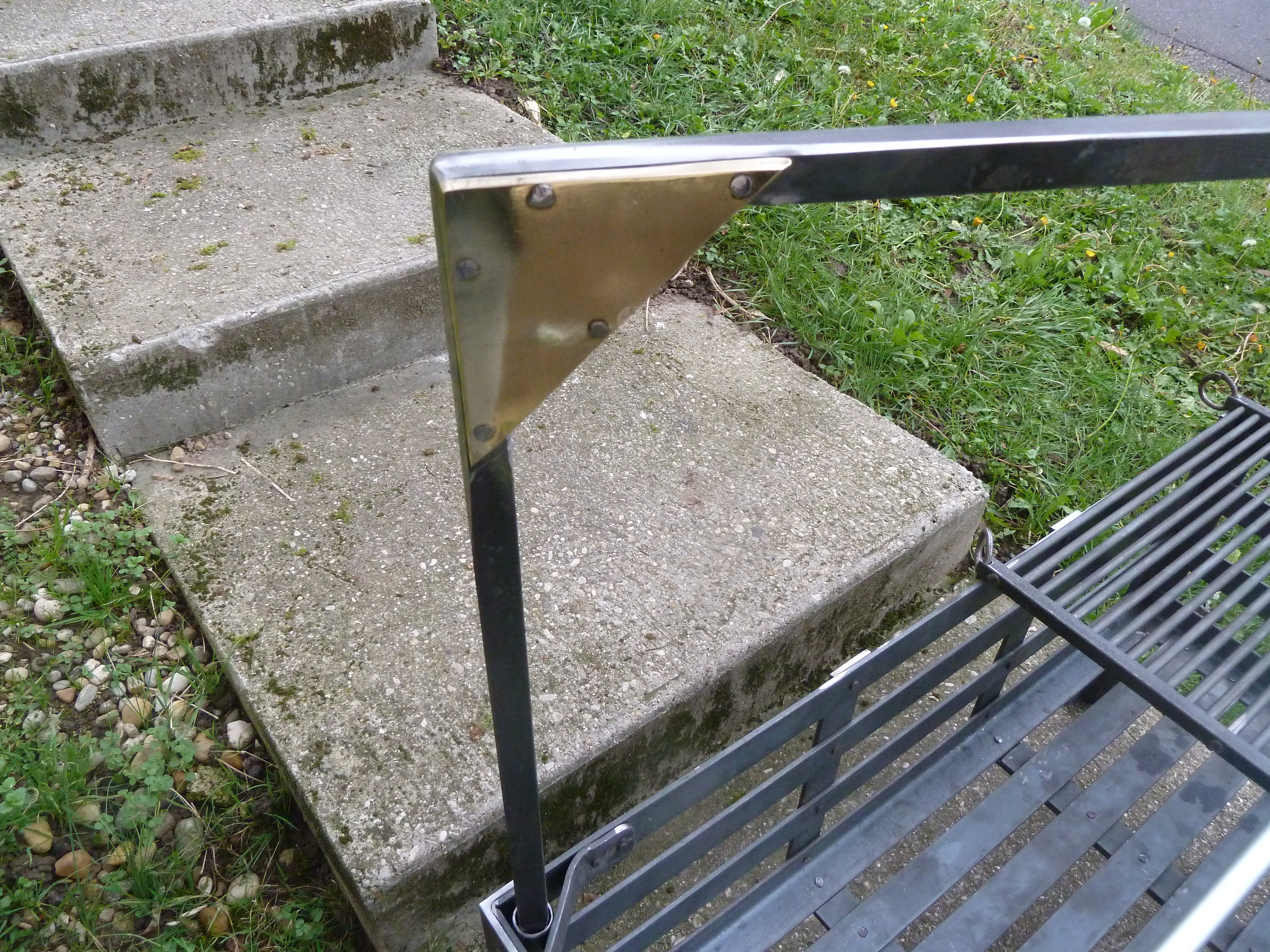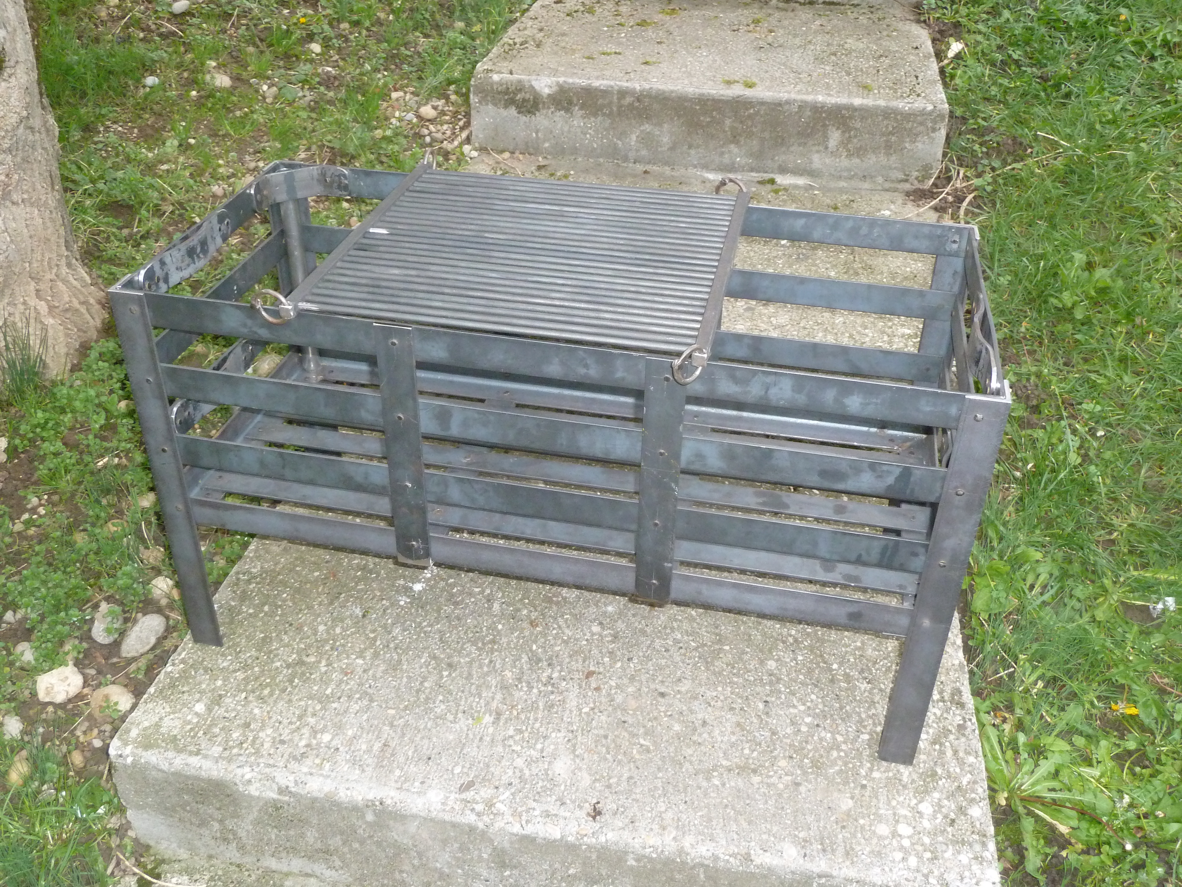 Un berceau à feu entièrement riveter avec grille, potence à chaudron et broche.