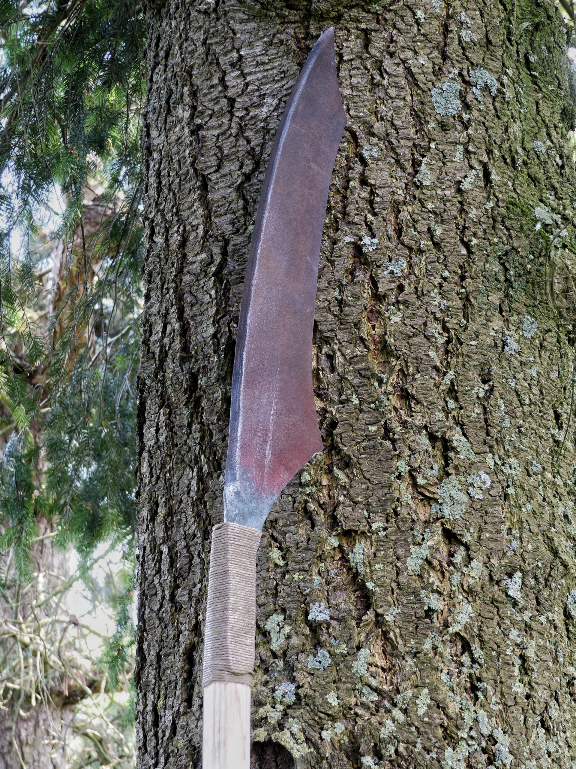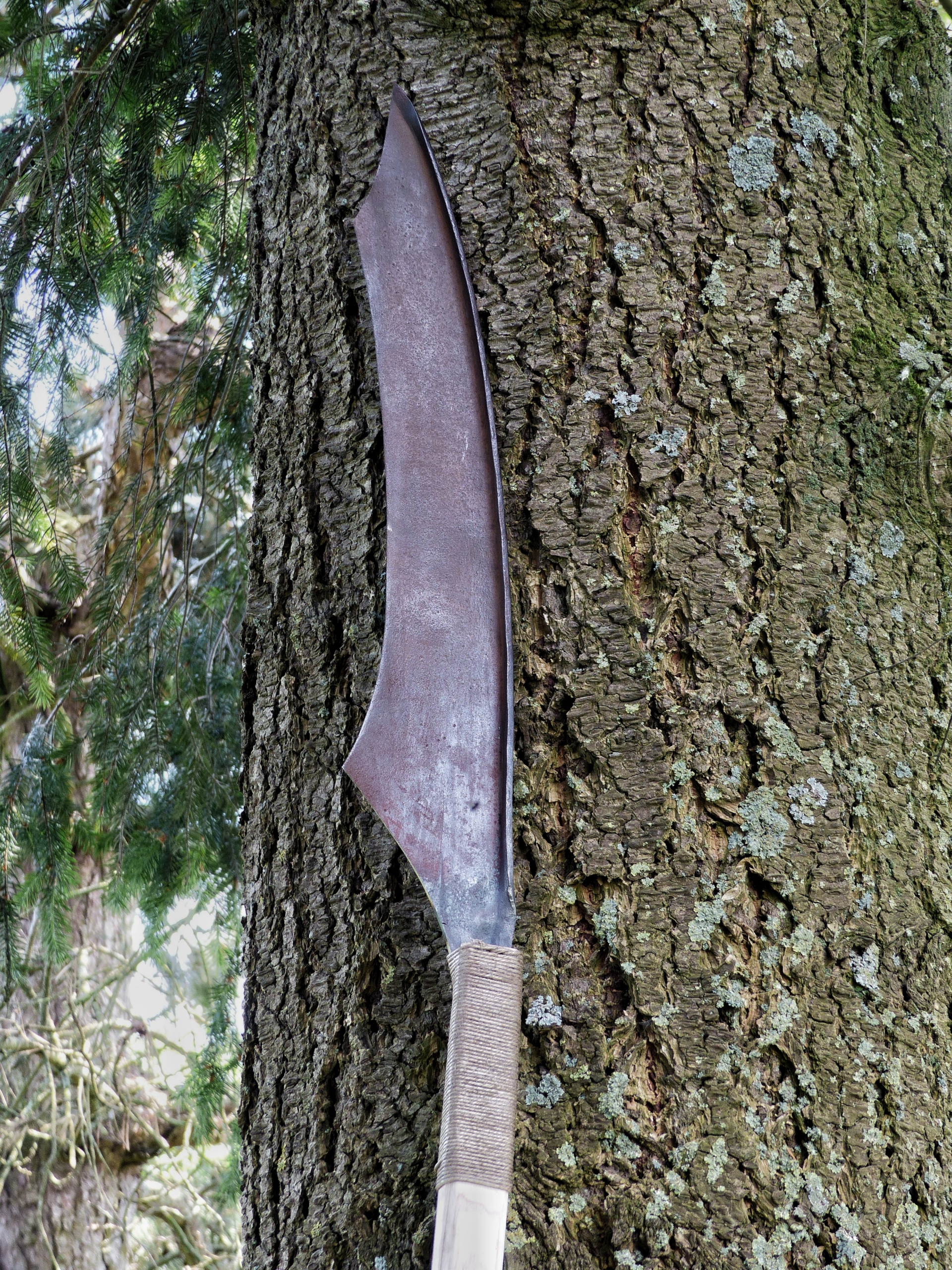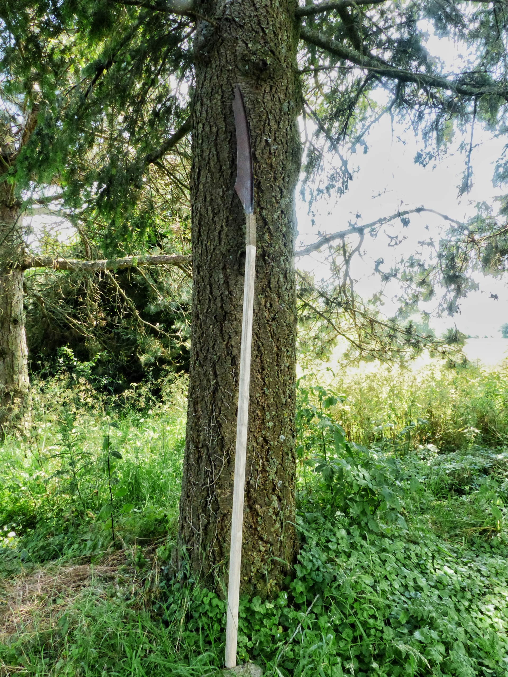 Une faux cassée trouvée en brocante, modifiée pour en faire une faux d’arme.