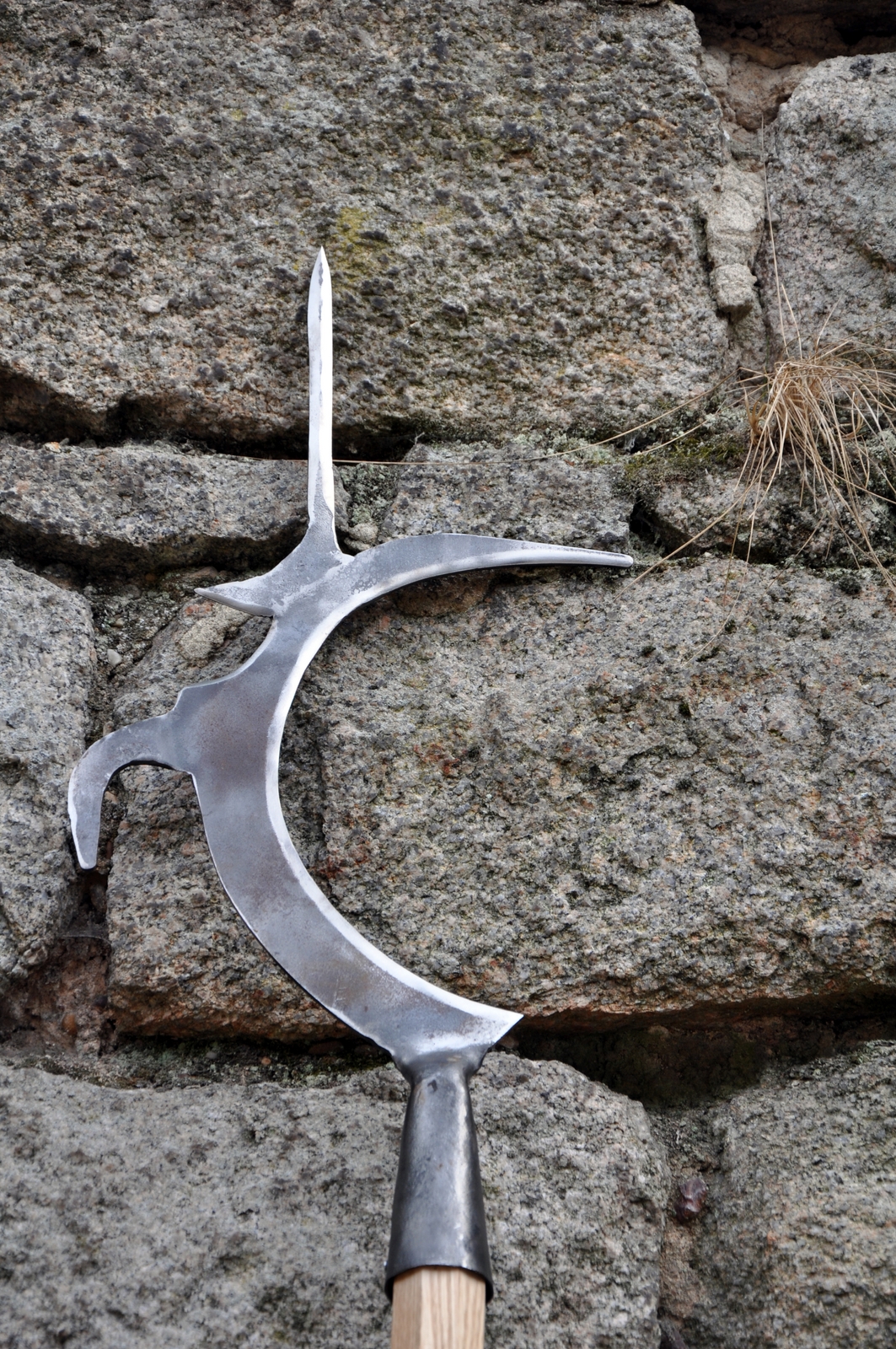 Non ceci n’est pas du médiéval fantastique mais bien une arme inspirée d’une source historique. La base est une faucille à douille, fendue a chaud en plusieurs endroits pour en faire ressortir des crochets et autres pointes. Utile en taille comme en estoc, elle reste relativement légère au maniement.