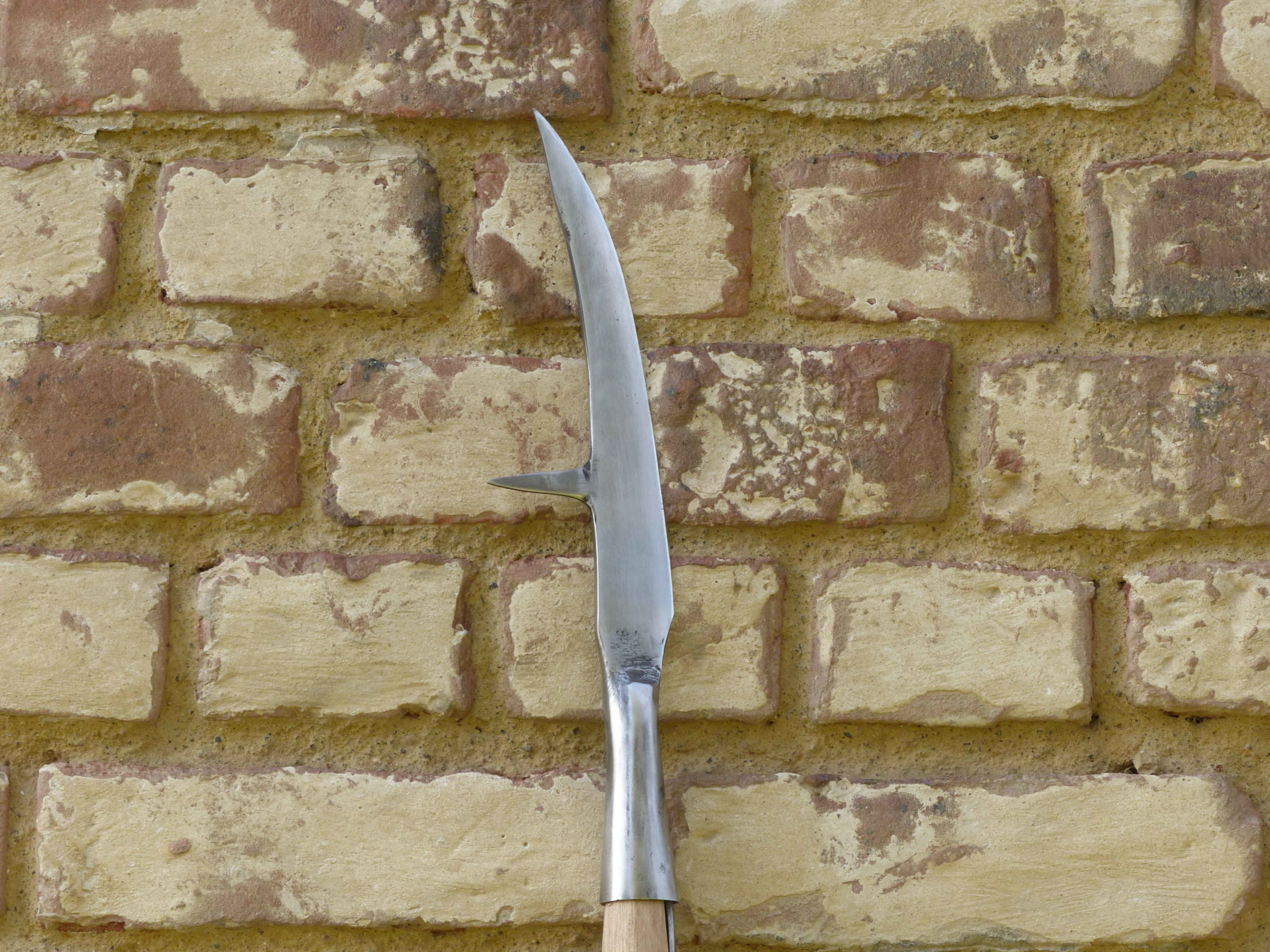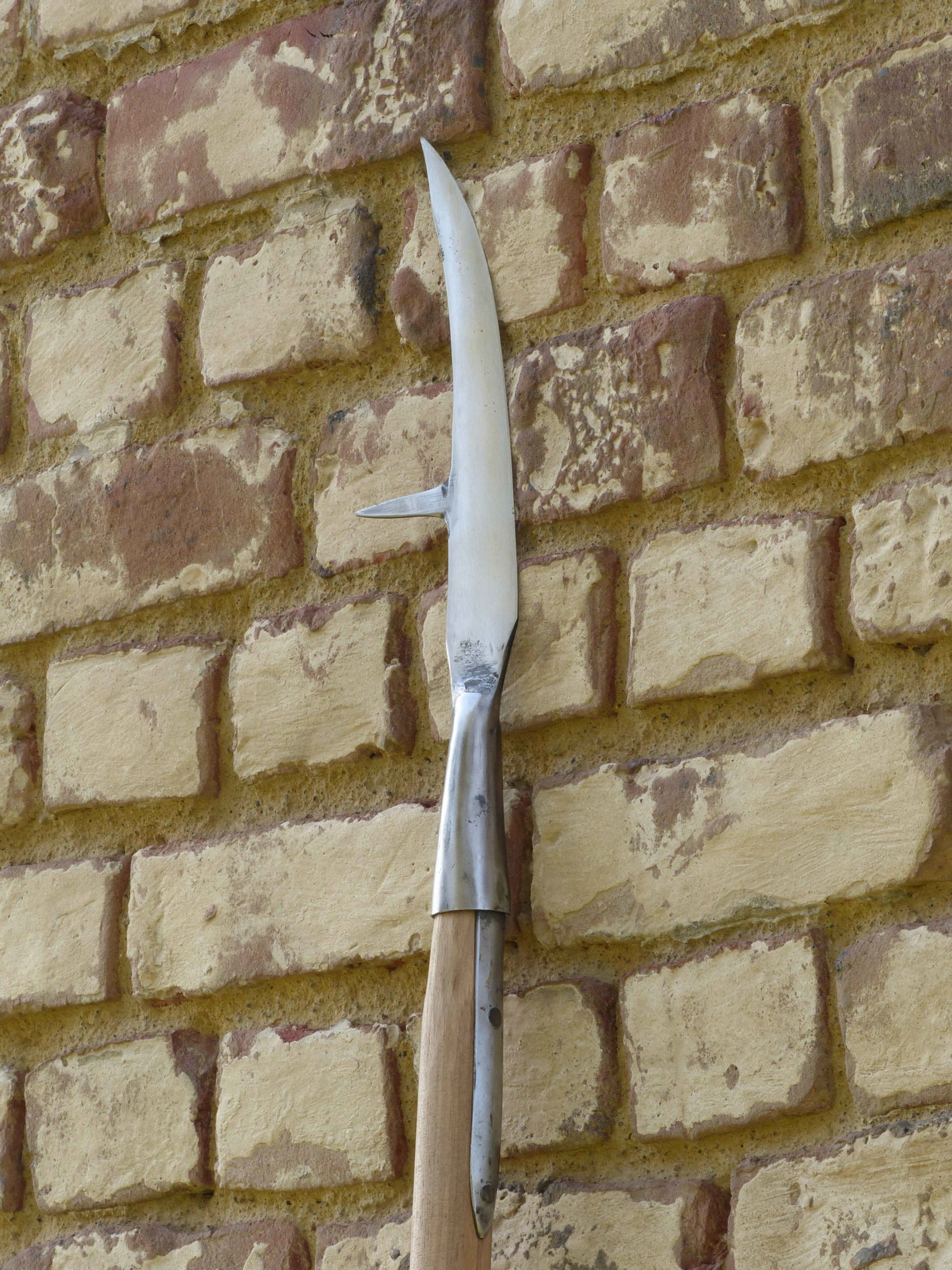 Une petite lame légère montée en hast. Le croc perpendiculaire permet d’armer de puissants estocs malgré le poids plume de la tête. Il permet aussi de parer une lame adverse plus facilement qu’avec une lance classique dépourvue d’ailettes.
