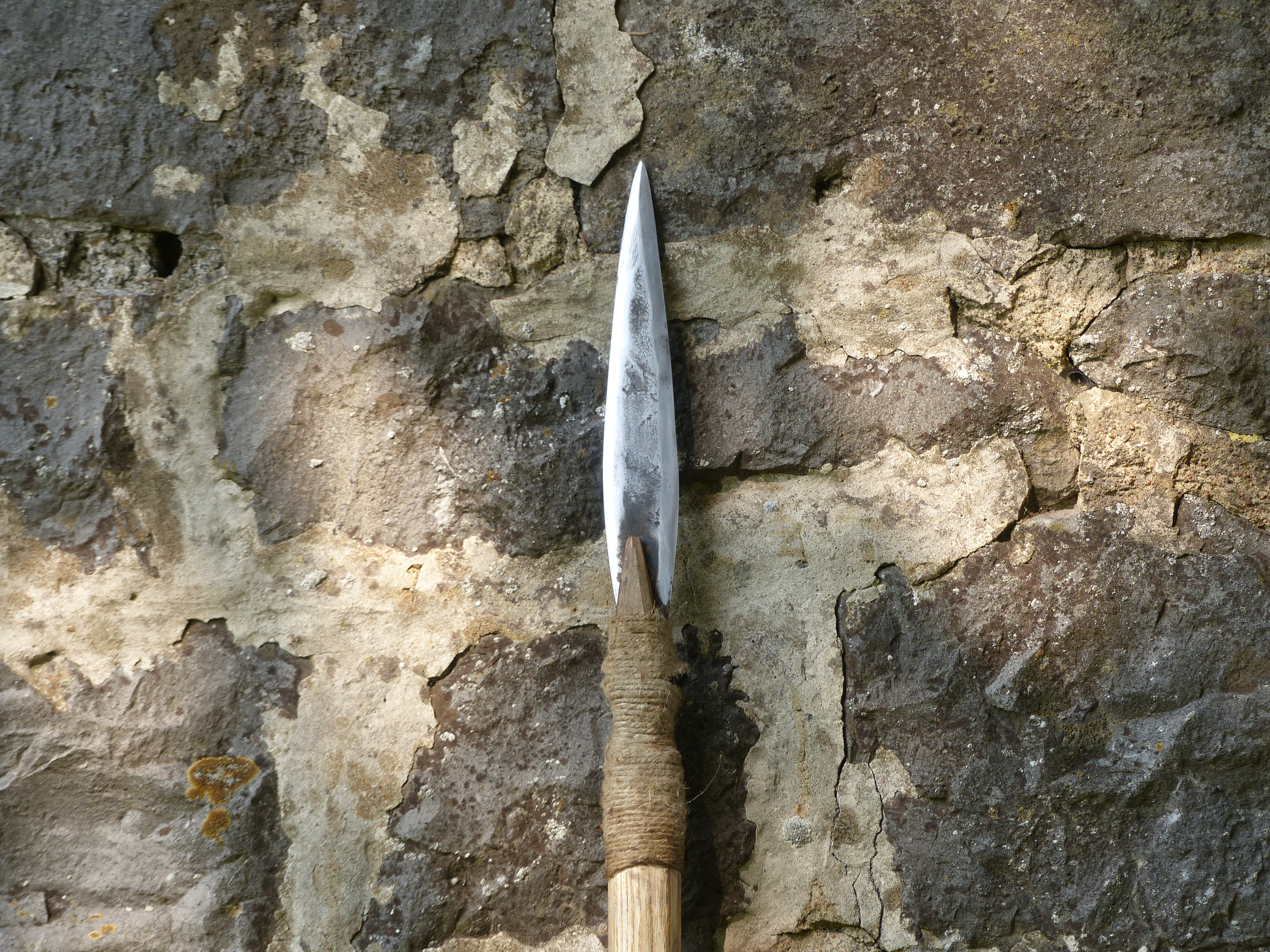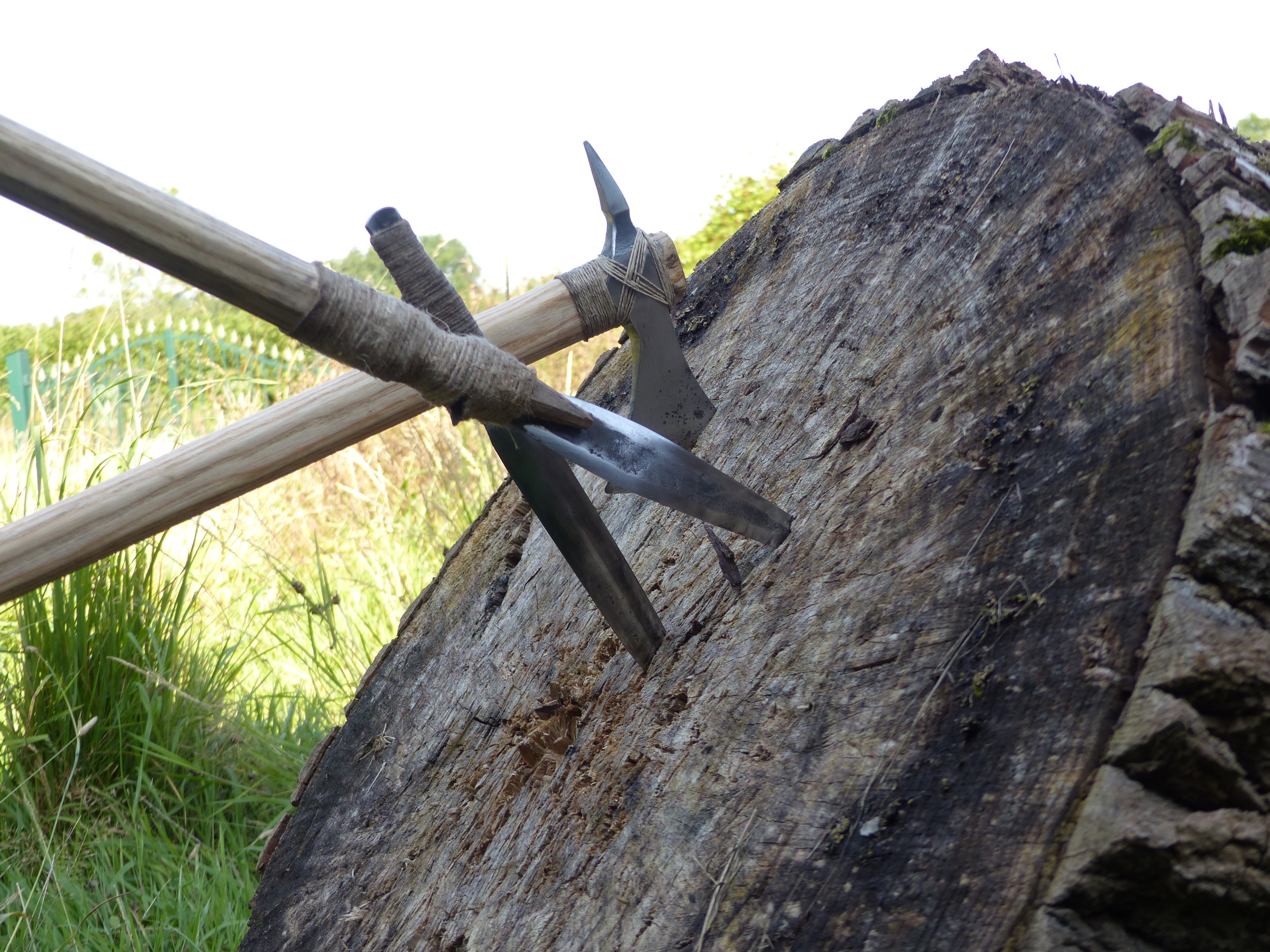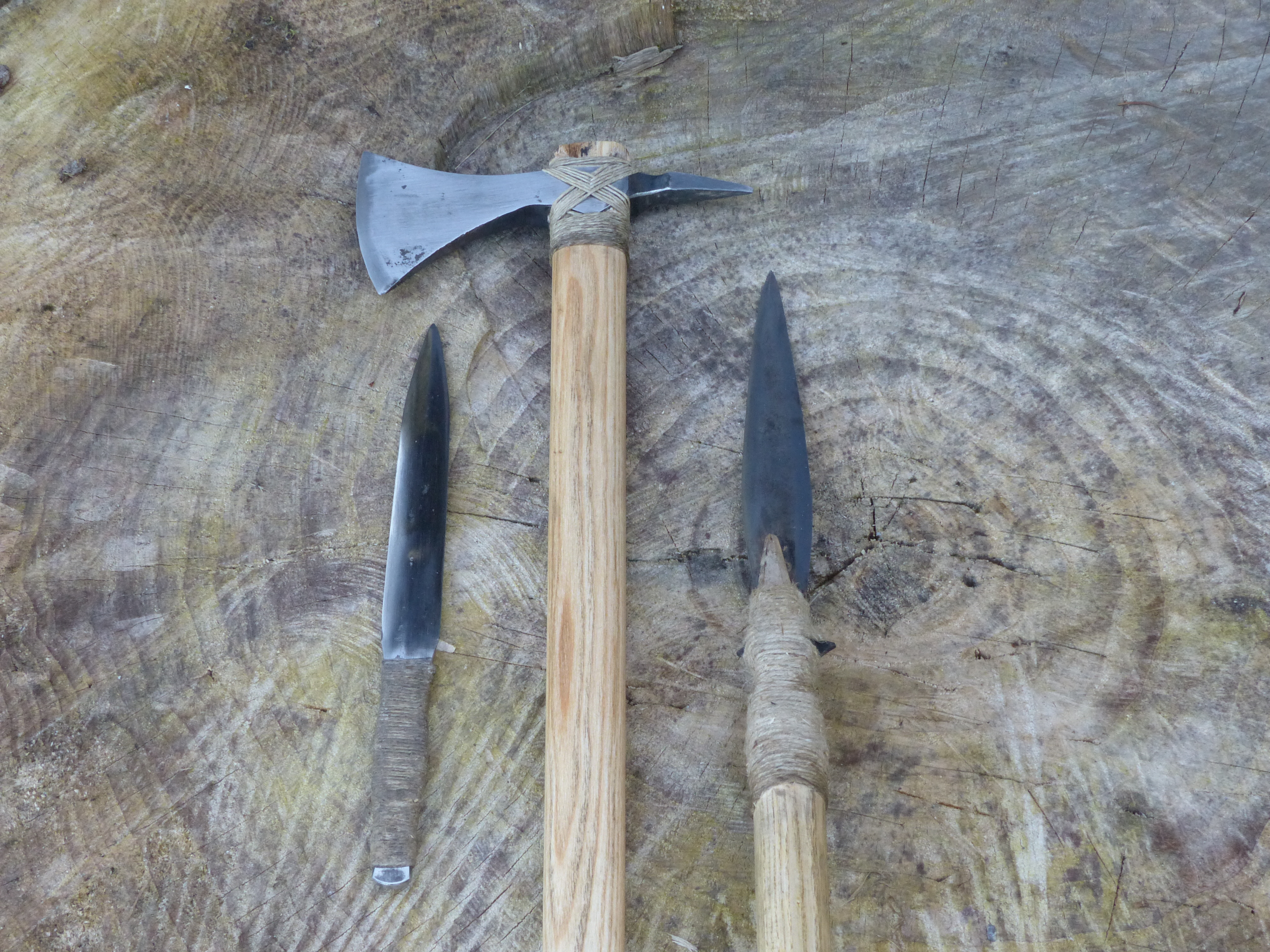 Une javeline, un couteau et un tomahawk assez bruts et ligaturés au fil de lin.