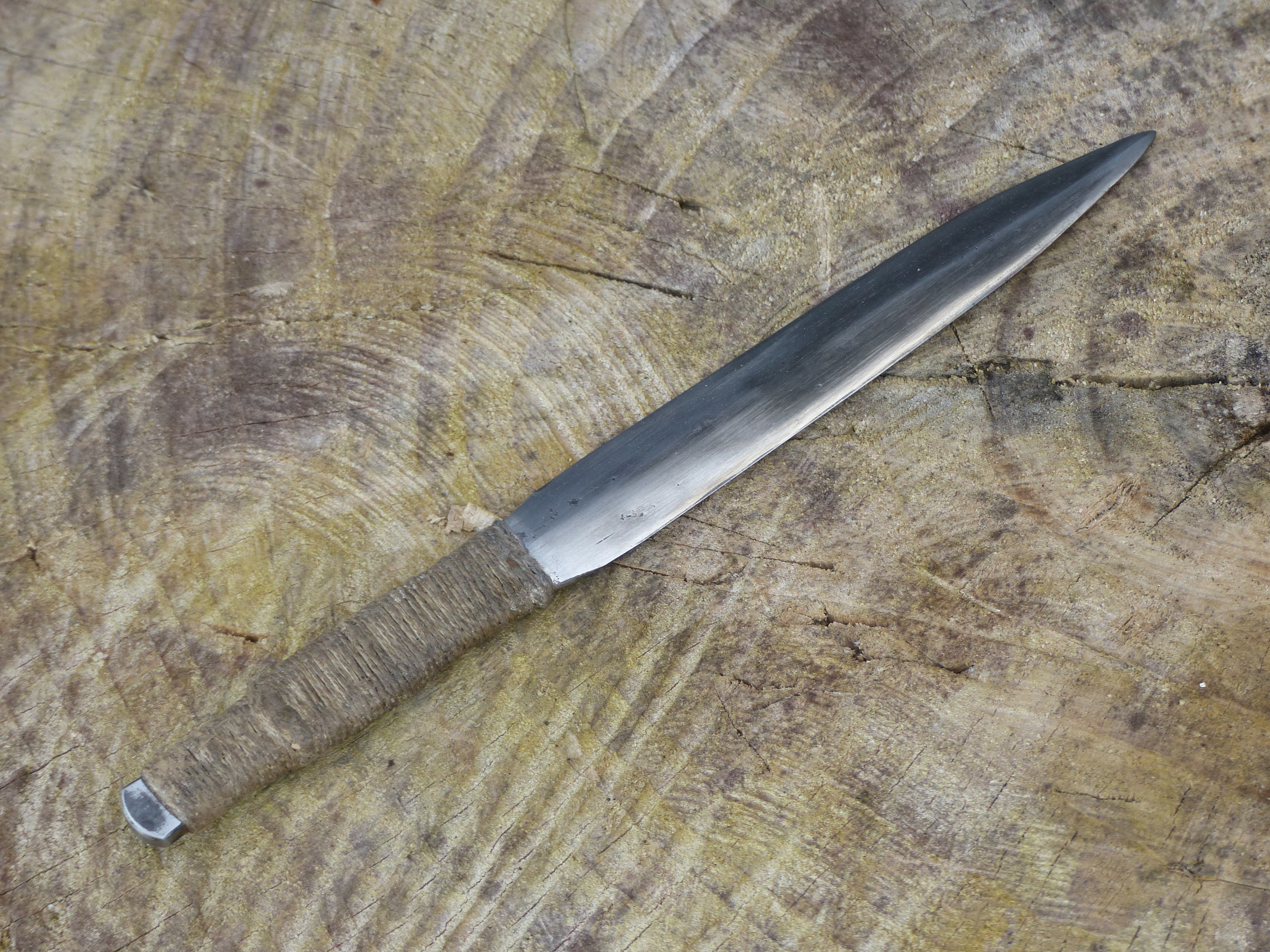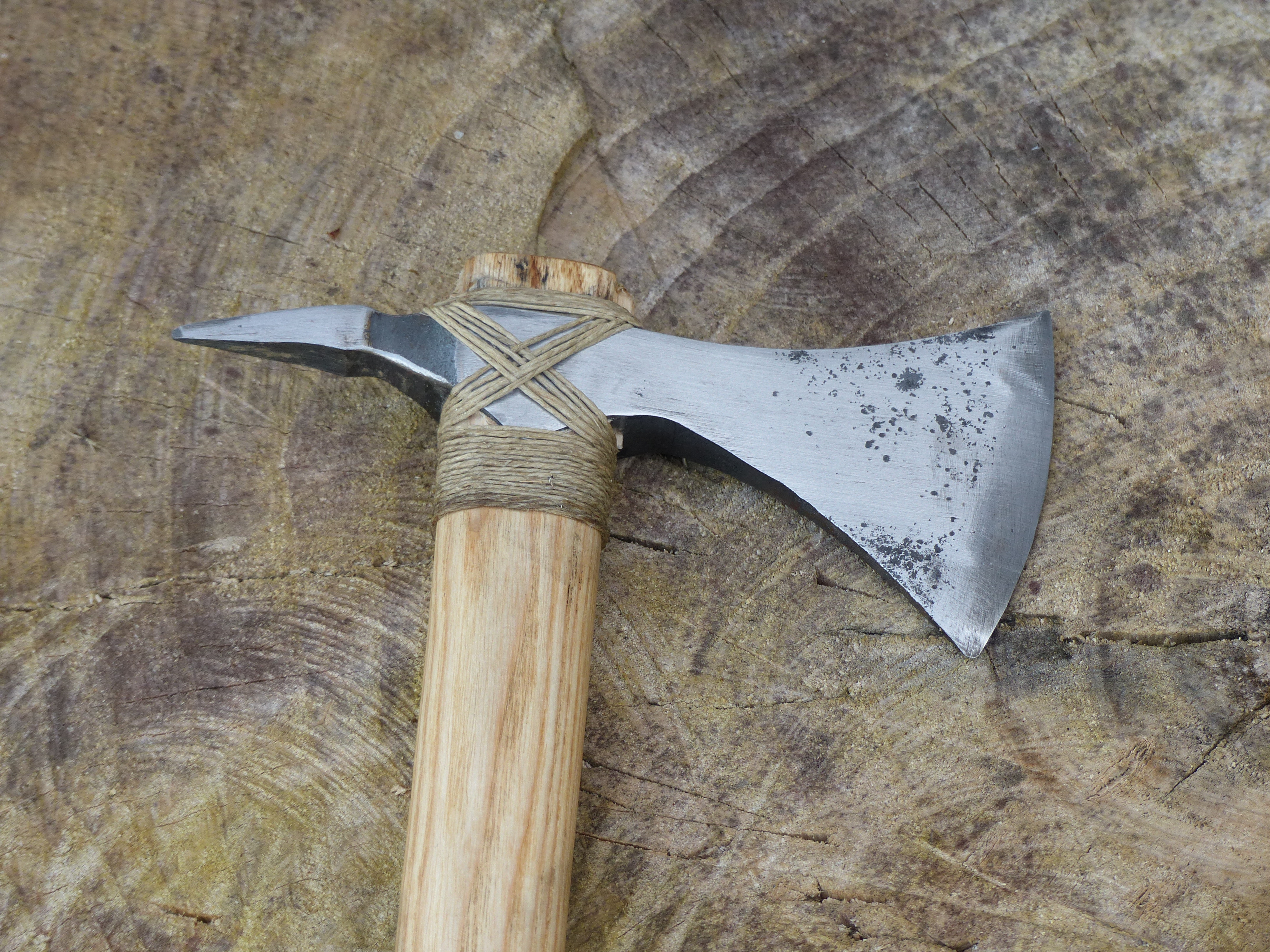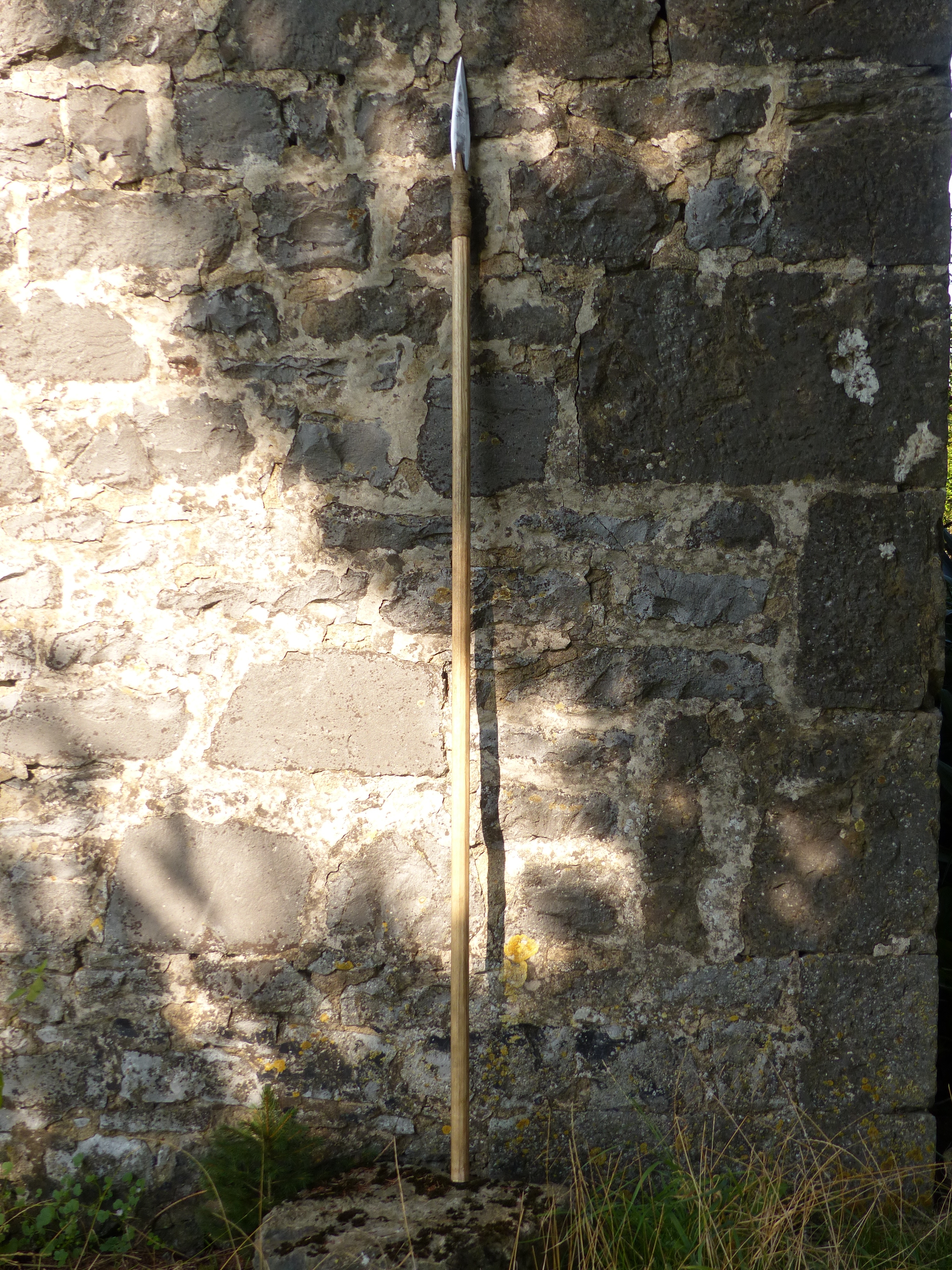 Une javeline, un couteau et un tomahawk assez bruts et ligaturés au fil de lin.