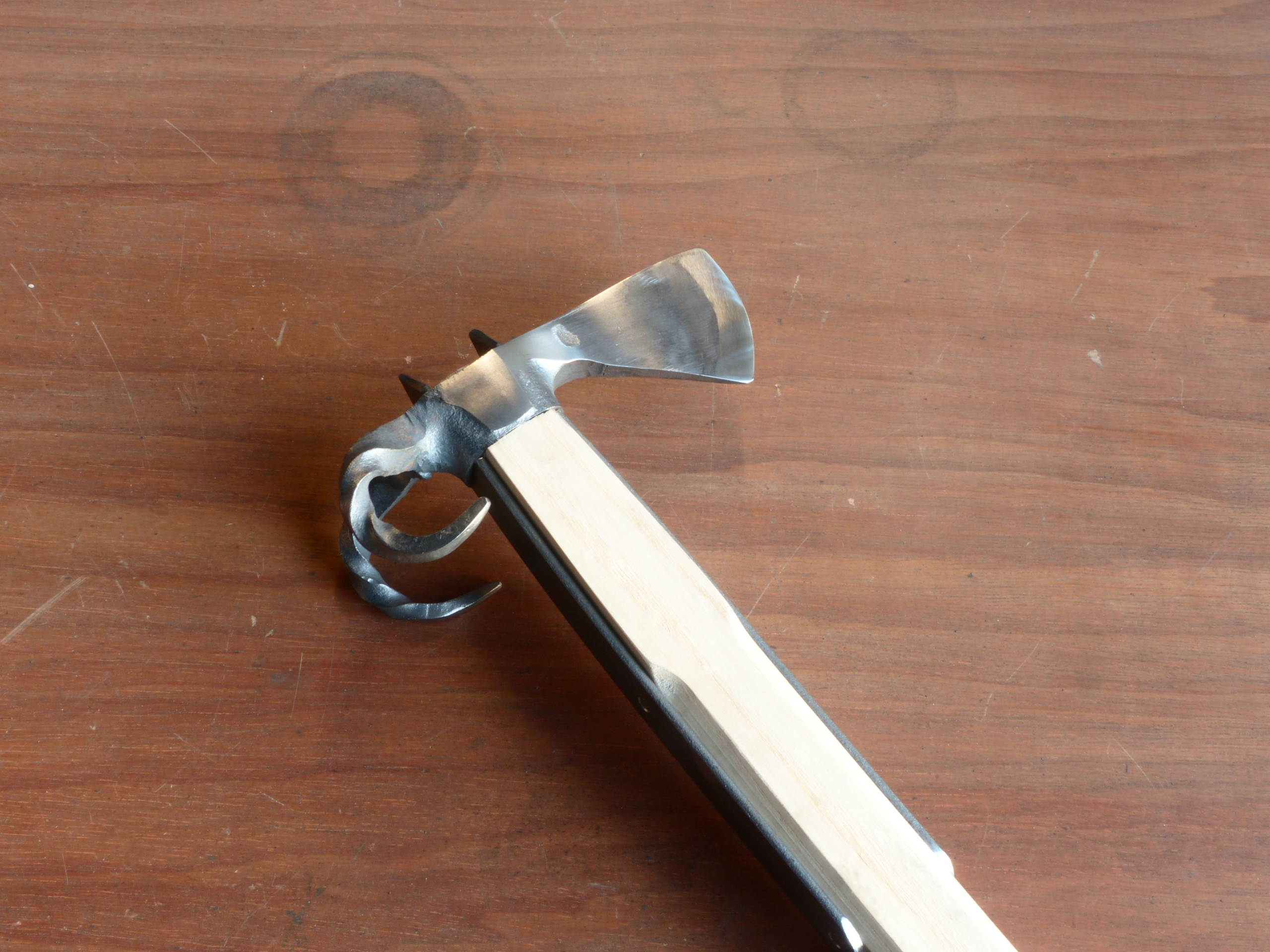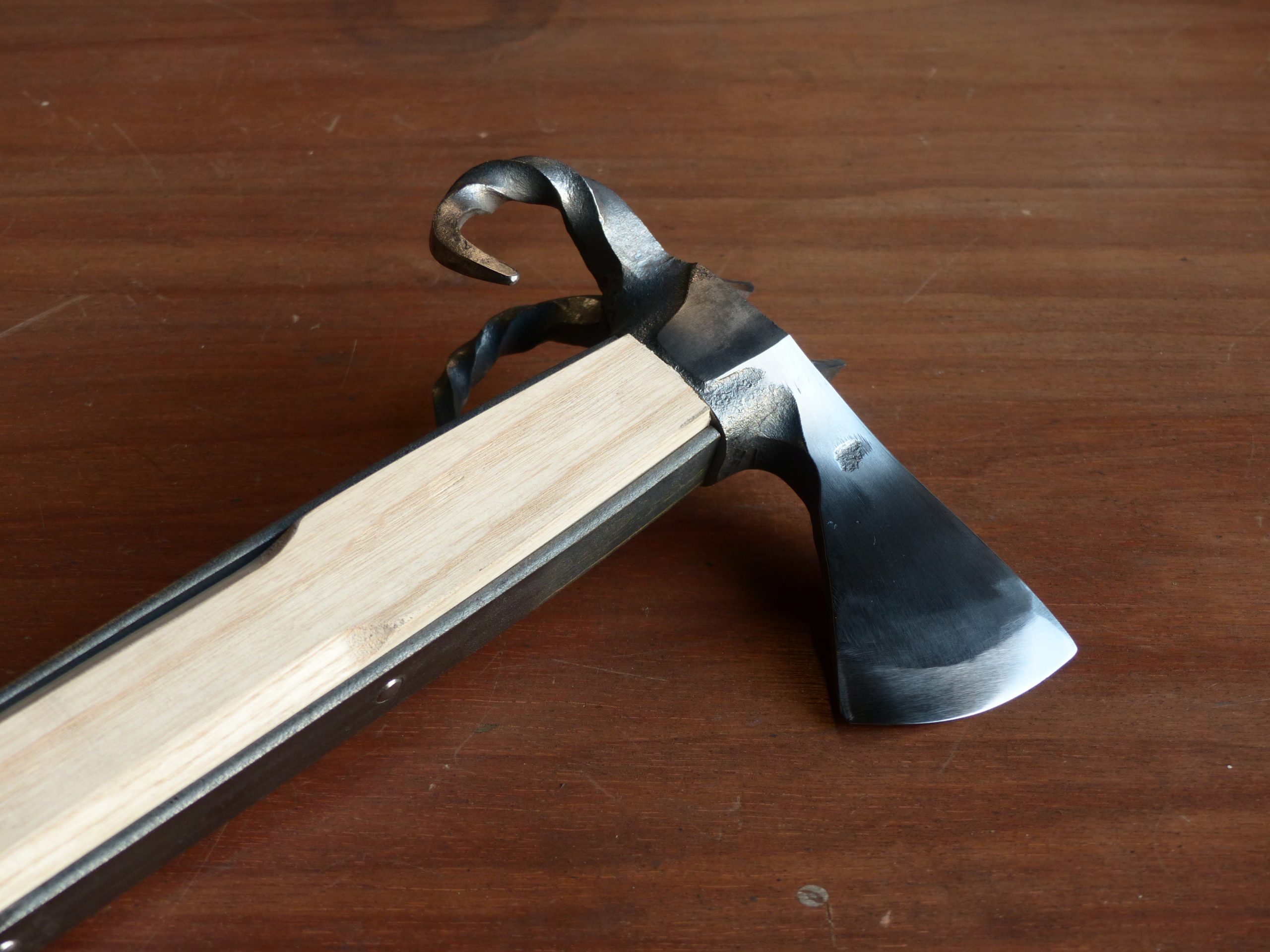 Encore une des biquettes que j’affectionne, mais que j’ai cette fois forgée en forme de hache plutôt que de marteau au niveau du museau.