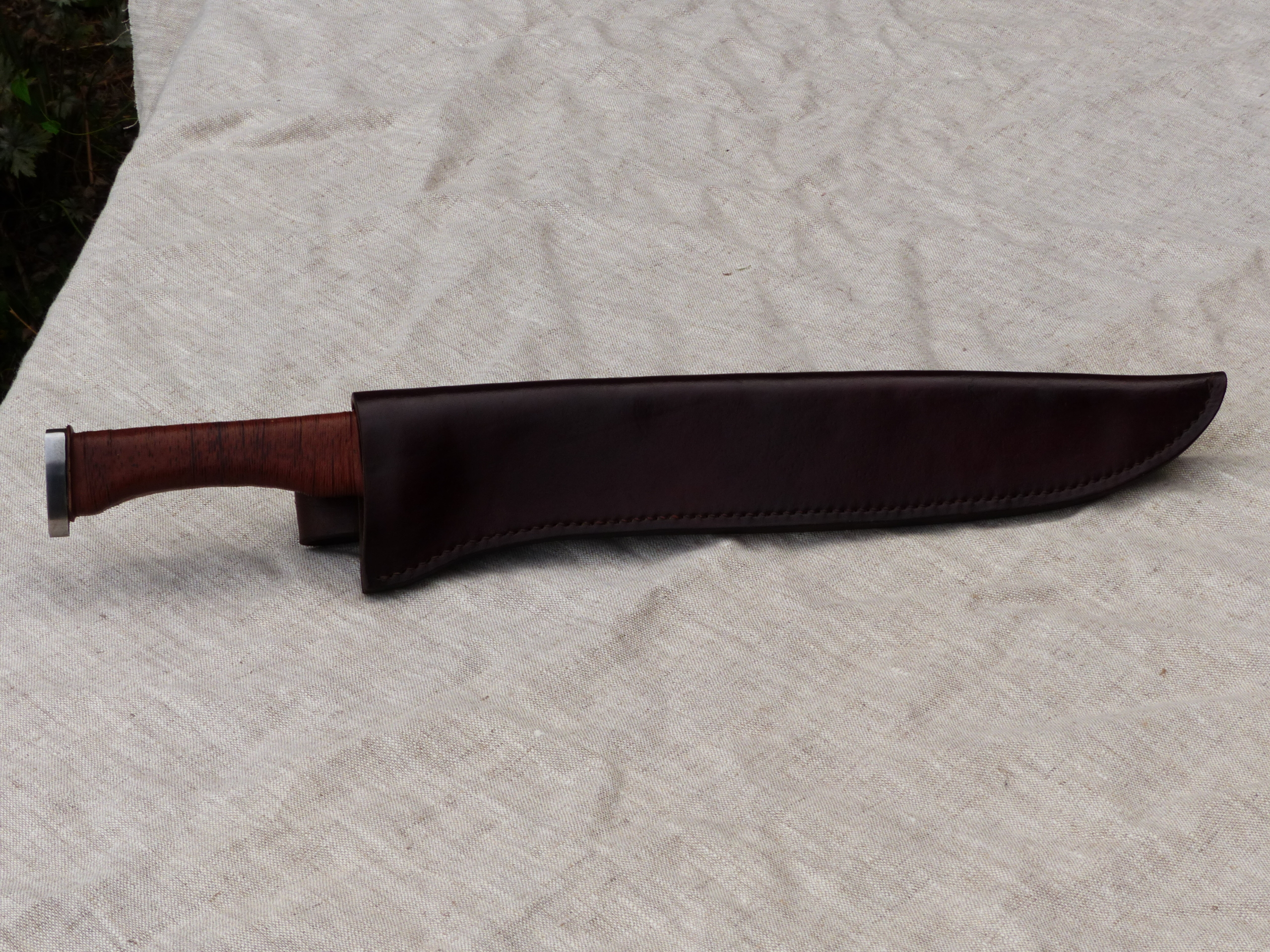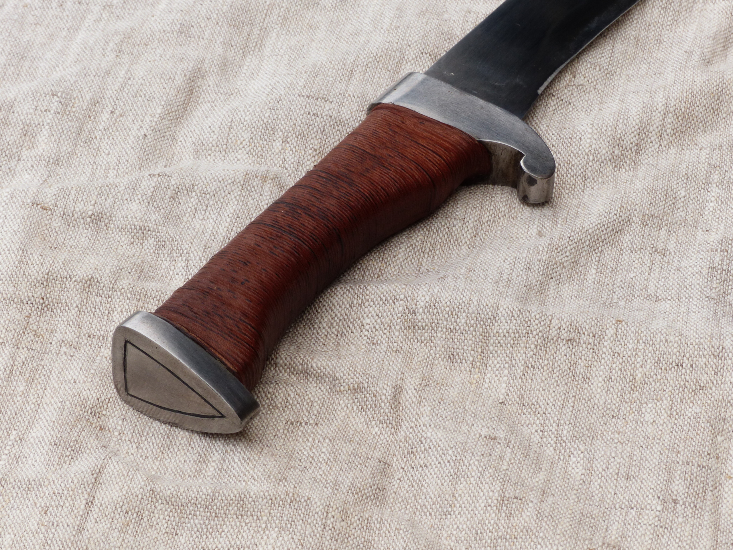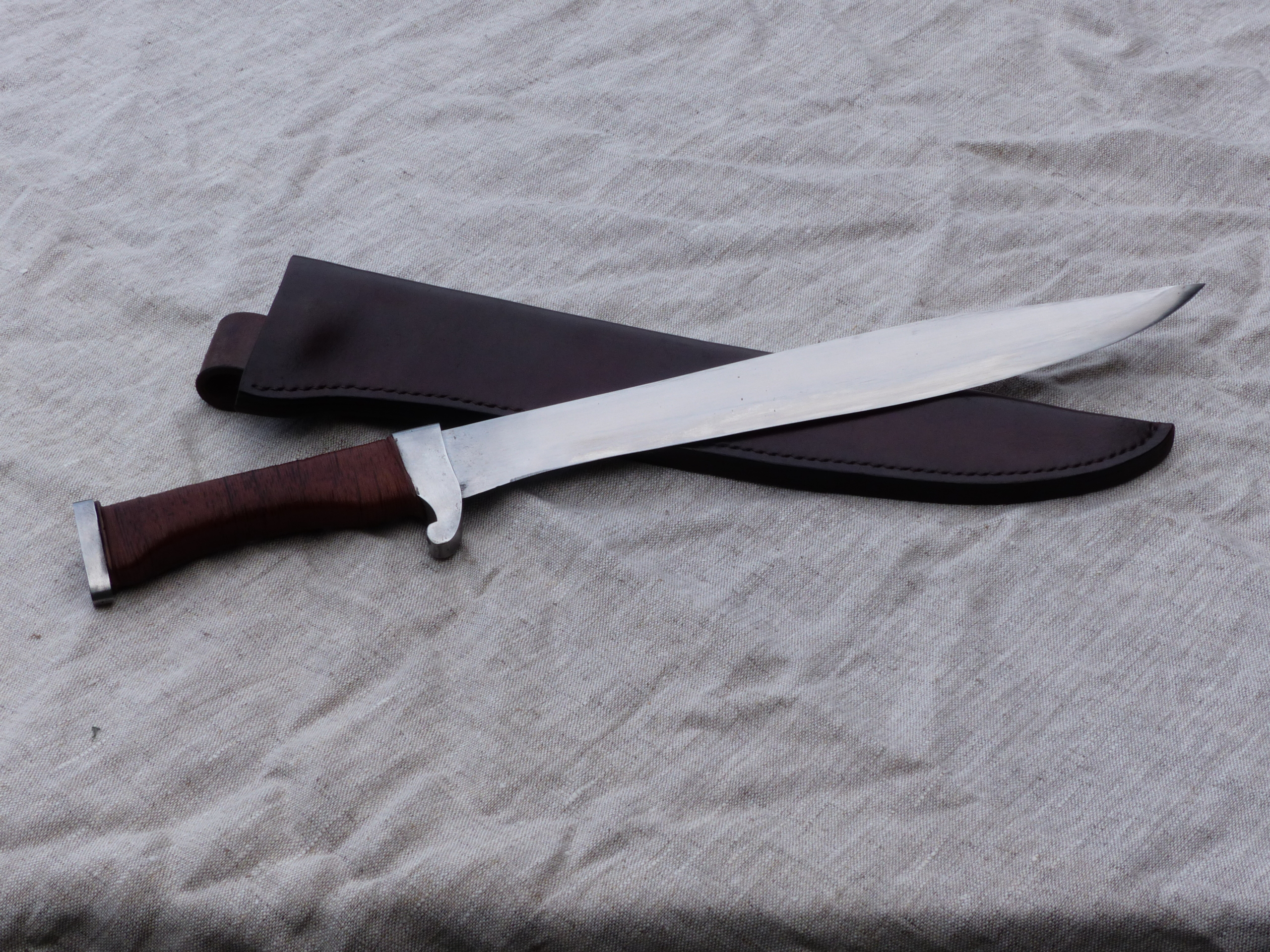Un coutelas court à la lame large légèrement ventrue. Sa garde et son pommeau solidaires de la soie ne permettent aucune prise de jeu et la prise en main est assurée par un assemblage de cuir fin et de fil de lin.