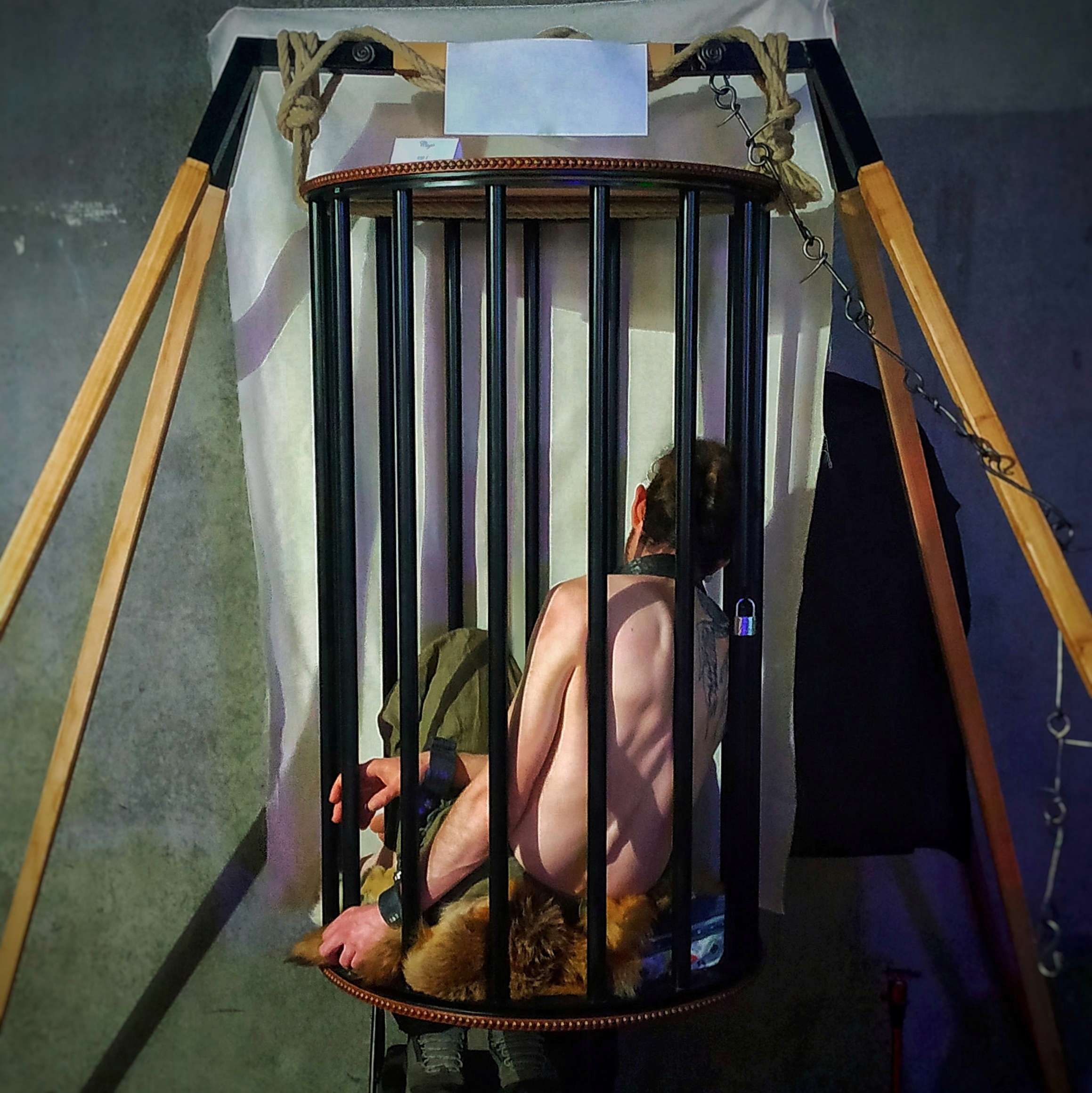 Cage cylindrique en acier. Les barreaux sont en tubes, peints en noir. Le socle et le plateau sont en bois lasurés et bordés de cuirs cloutés.