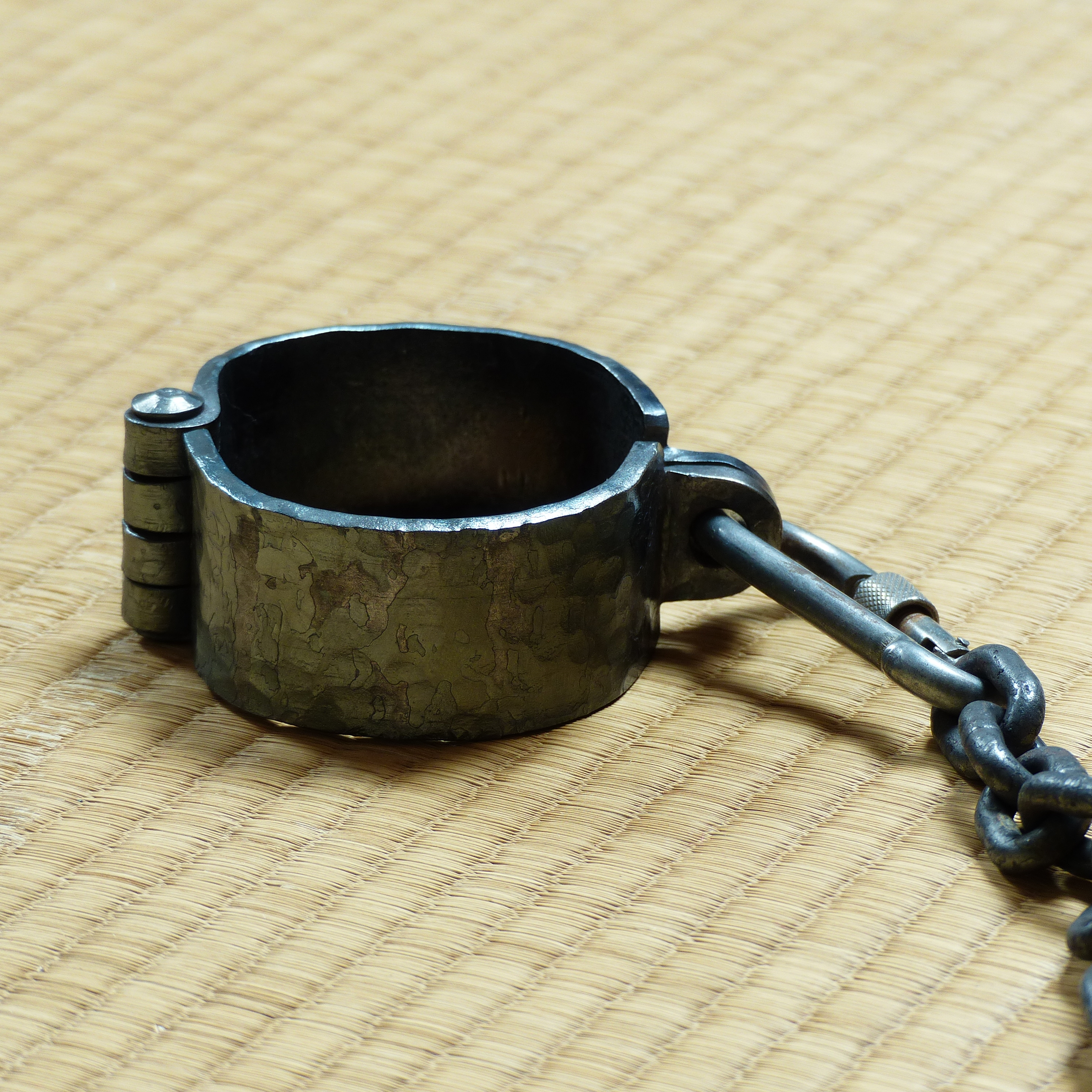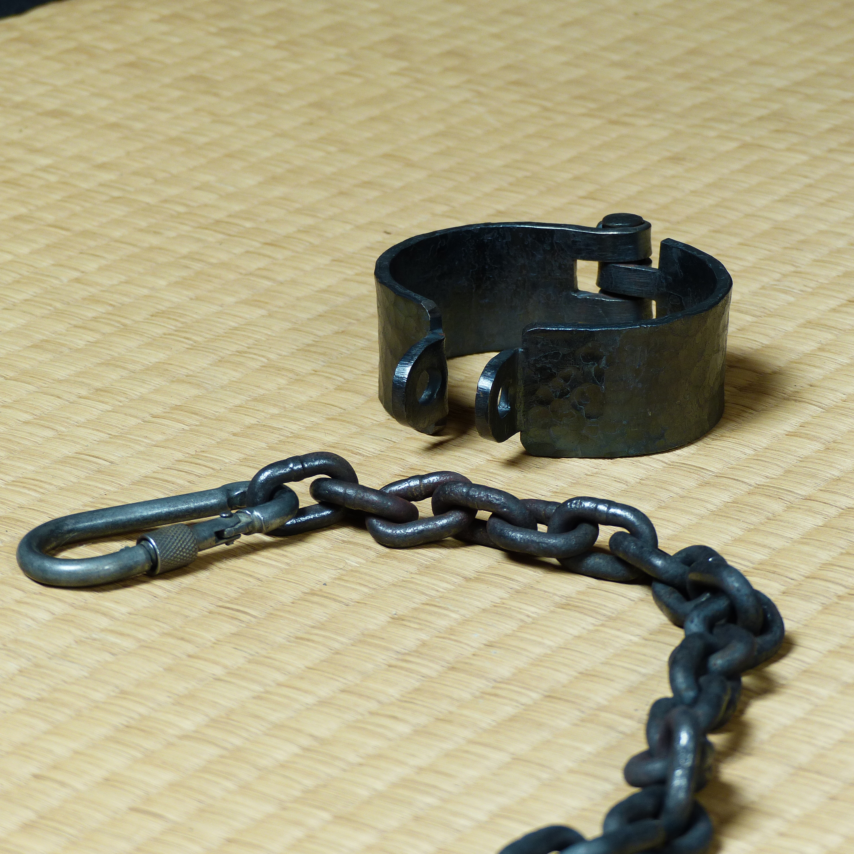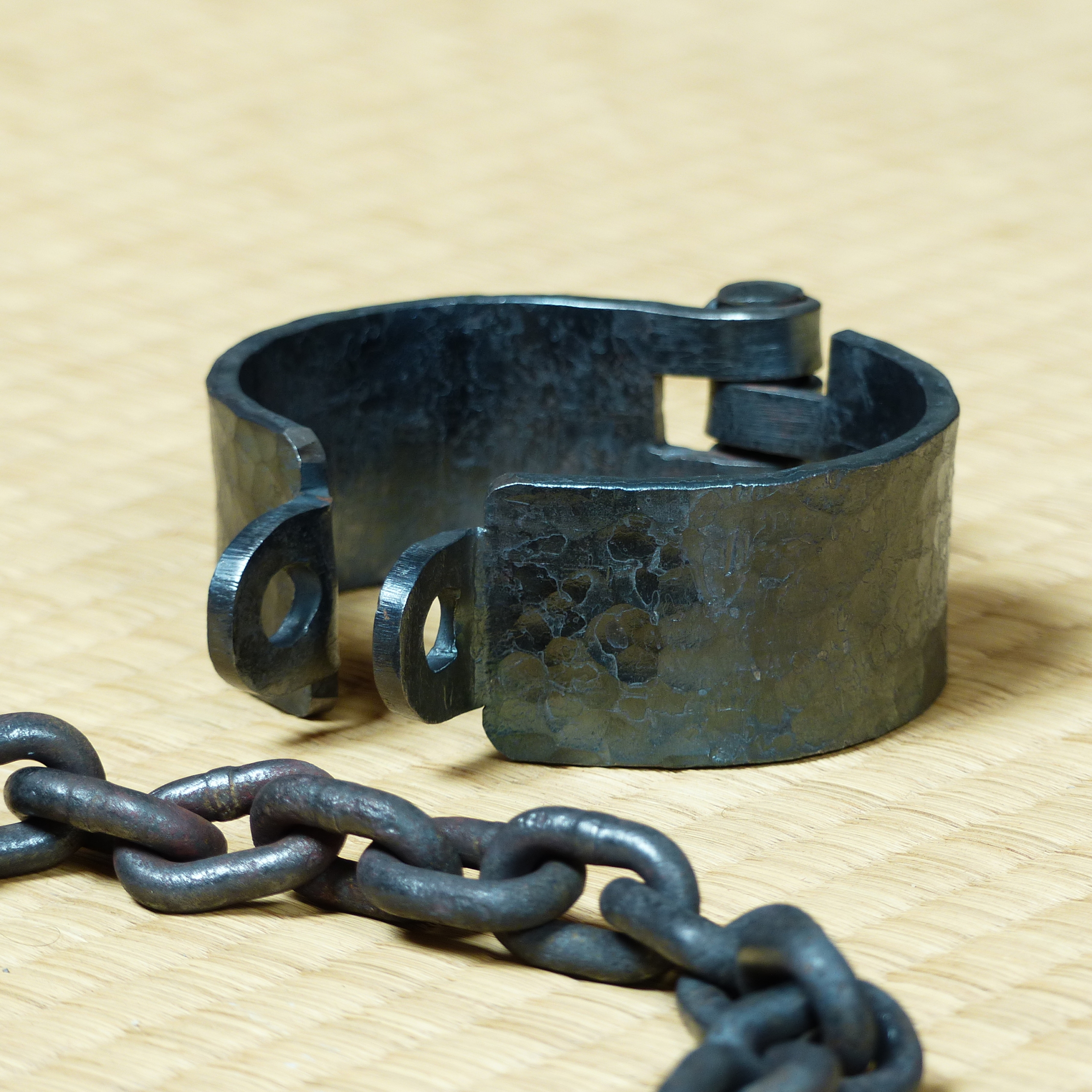 Entrave de cheville, martelée main, associée à une chaîne industrielle noircie au feu.
