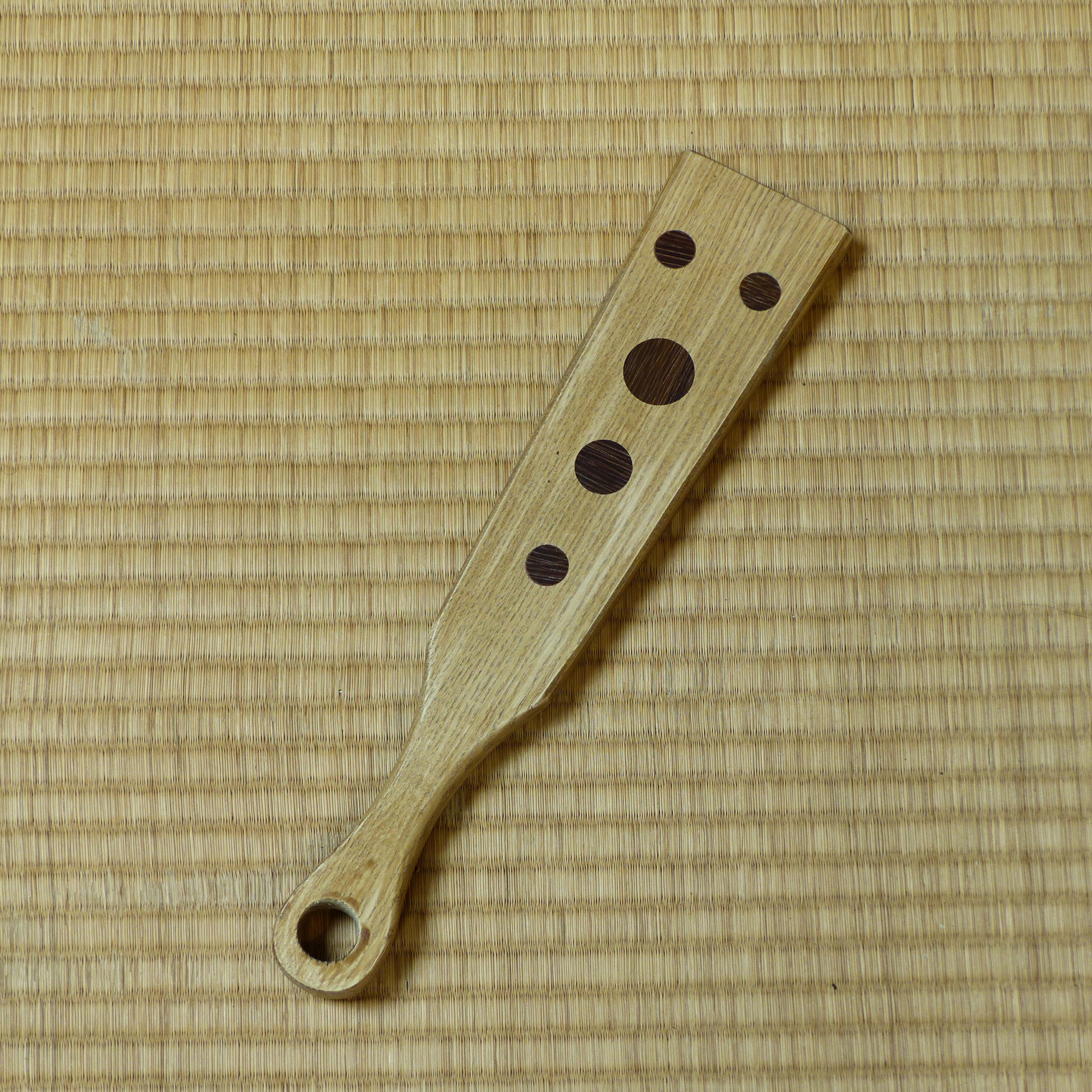 Paddle en acacia avec inclusions de bois exotique (ipé), entièrement poncé main et traité avec un mélange d’huile de lin et de cire d’abeille.