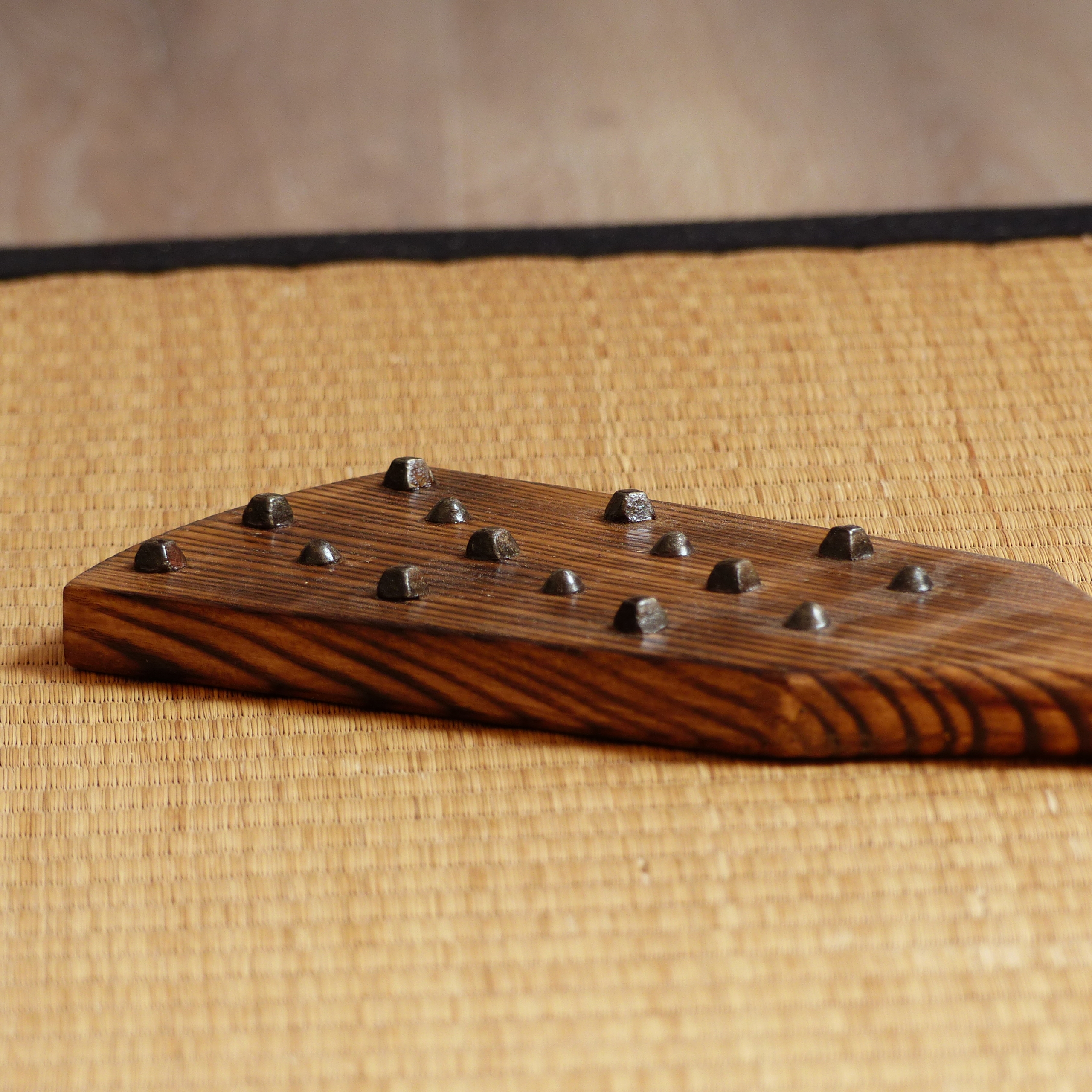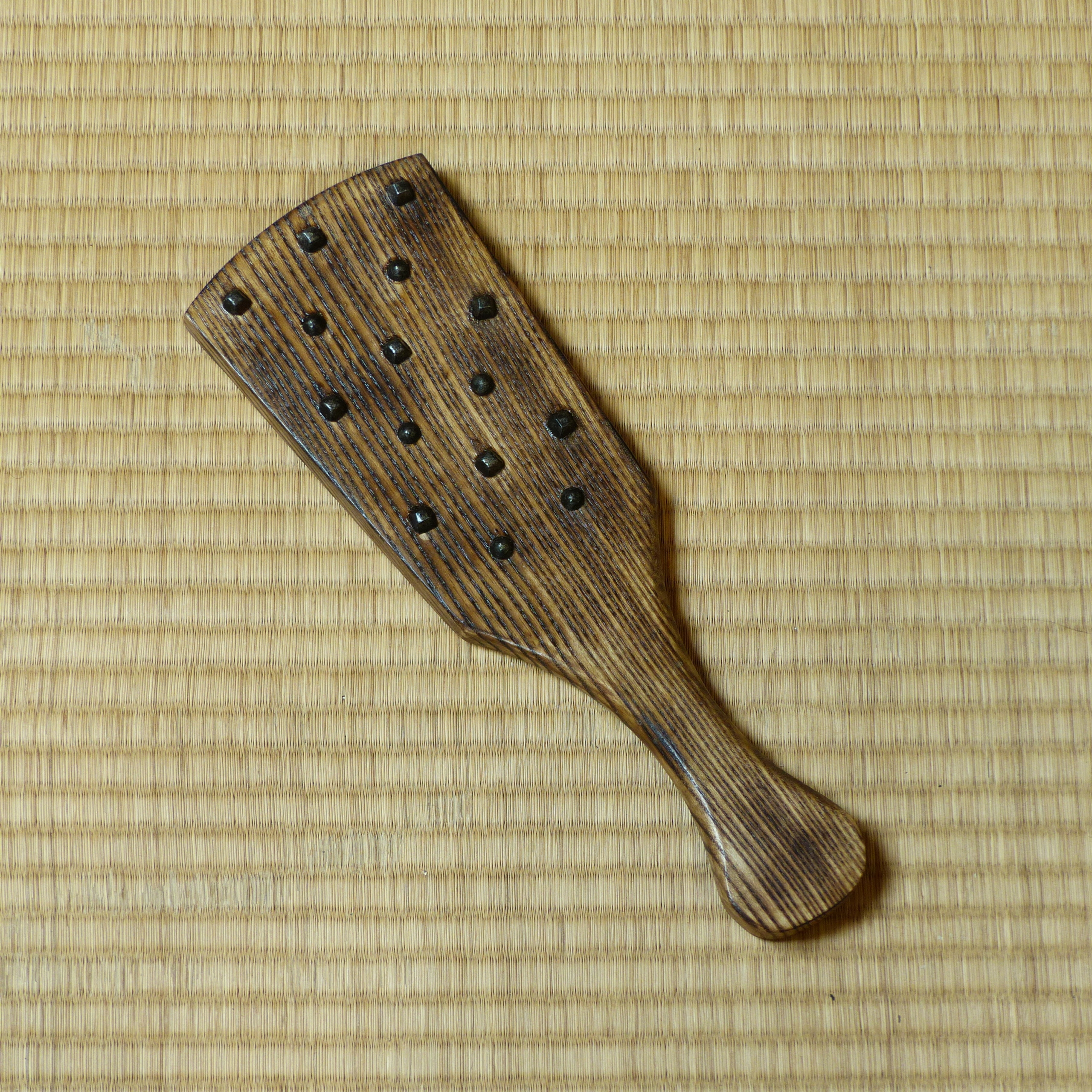 Paddle en chêne avec clous de sabotier. Le bois a été brûlé pour faire ressortir les veines du bois, puis vernis.