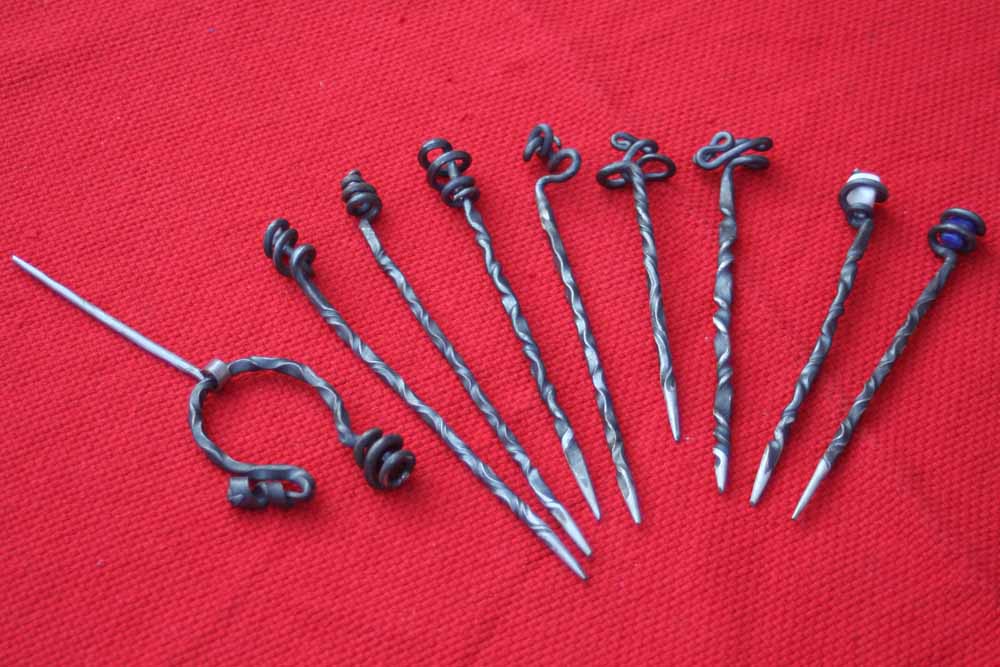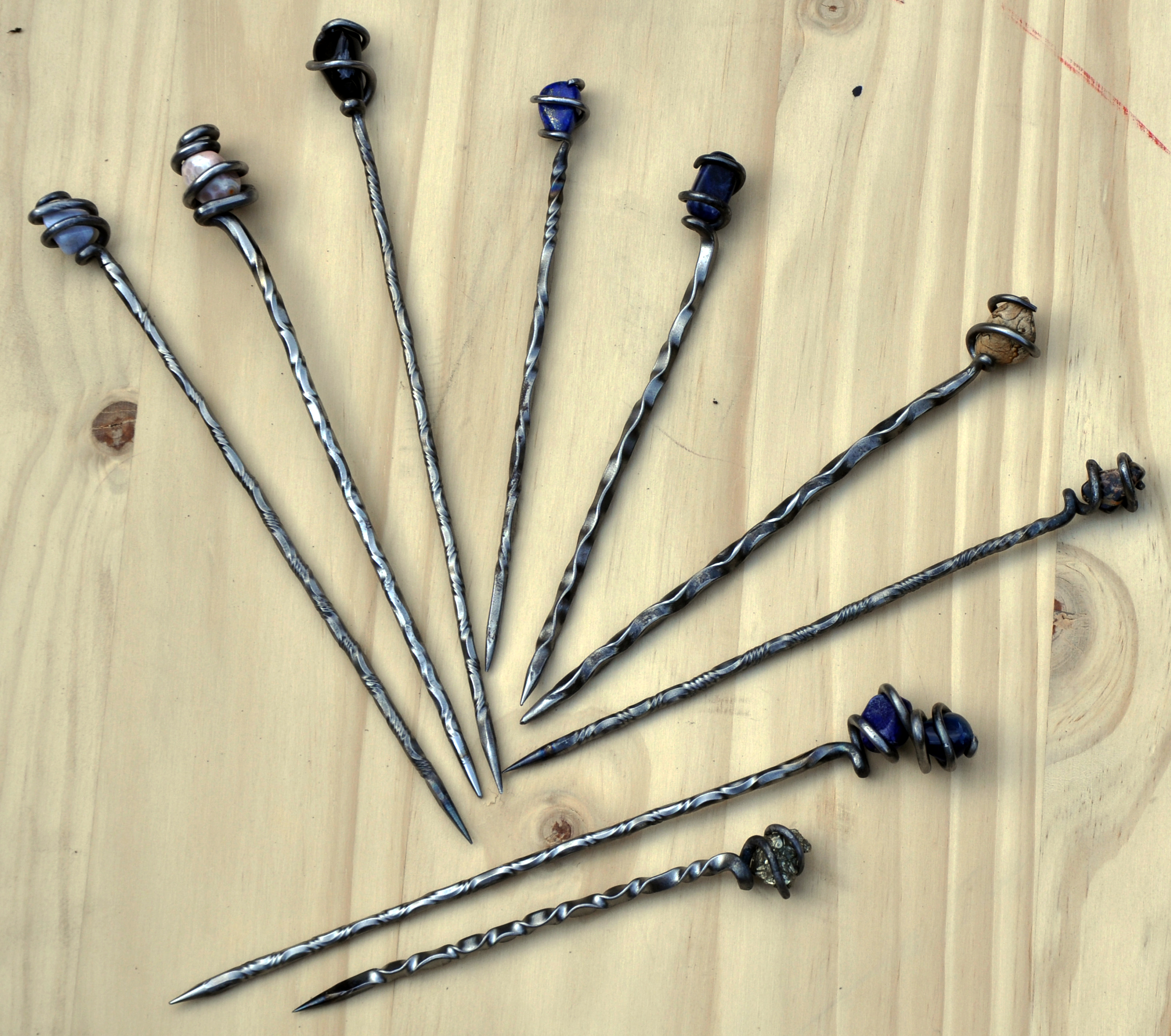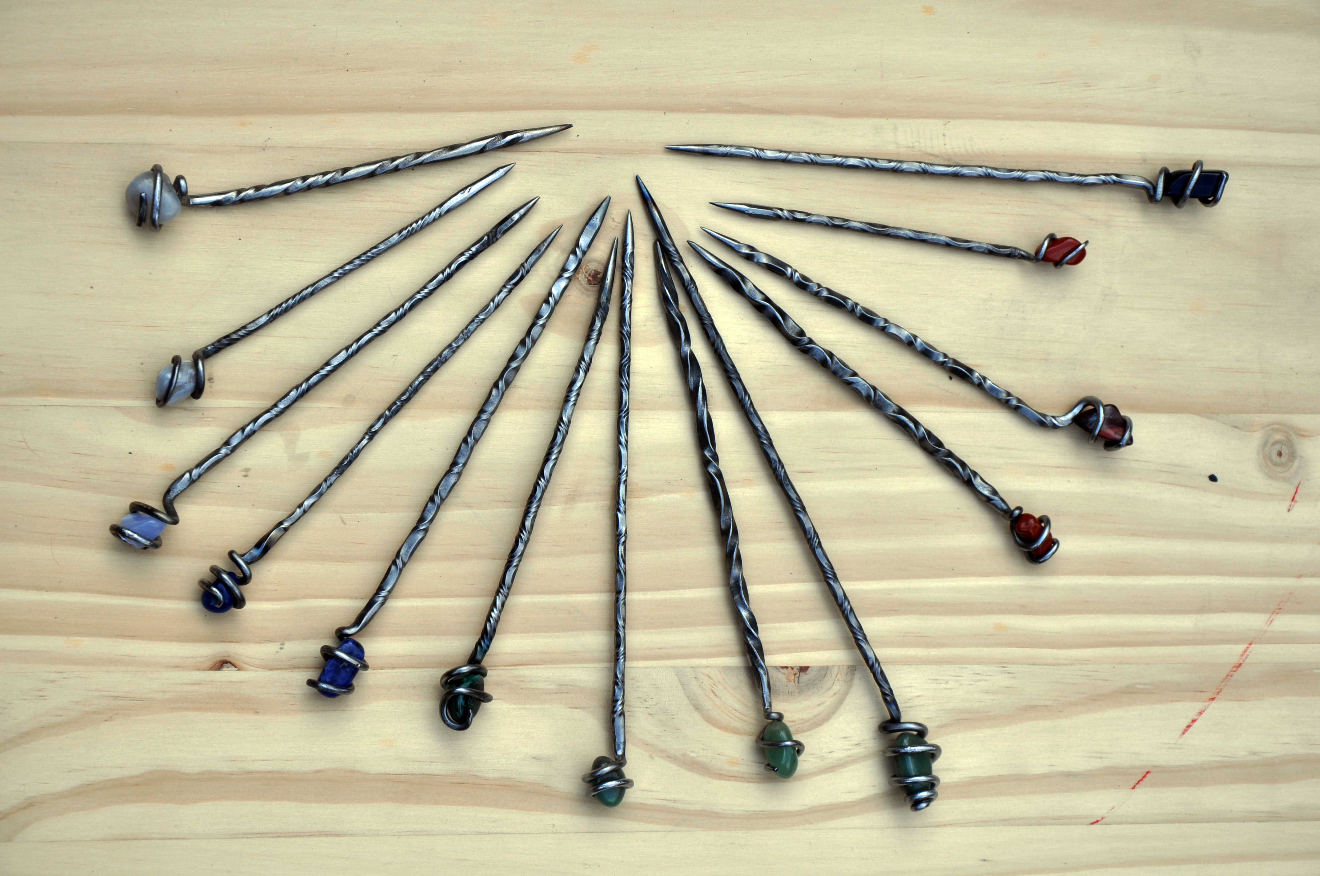 Des pics élégants destinés à des usages variés. Tous forgés en fer et non en acier, afin d’éviter qu’ils ne se corrodent trop rapidement. Les entrelacs et les pierres sont laissés à votre choix (howlite, lapis-lazulis, jaspe rouge, améthyste, jais… ) Les pointes sont effilées ou arrondies suivant l’usage que vous souhaitez en faire.
